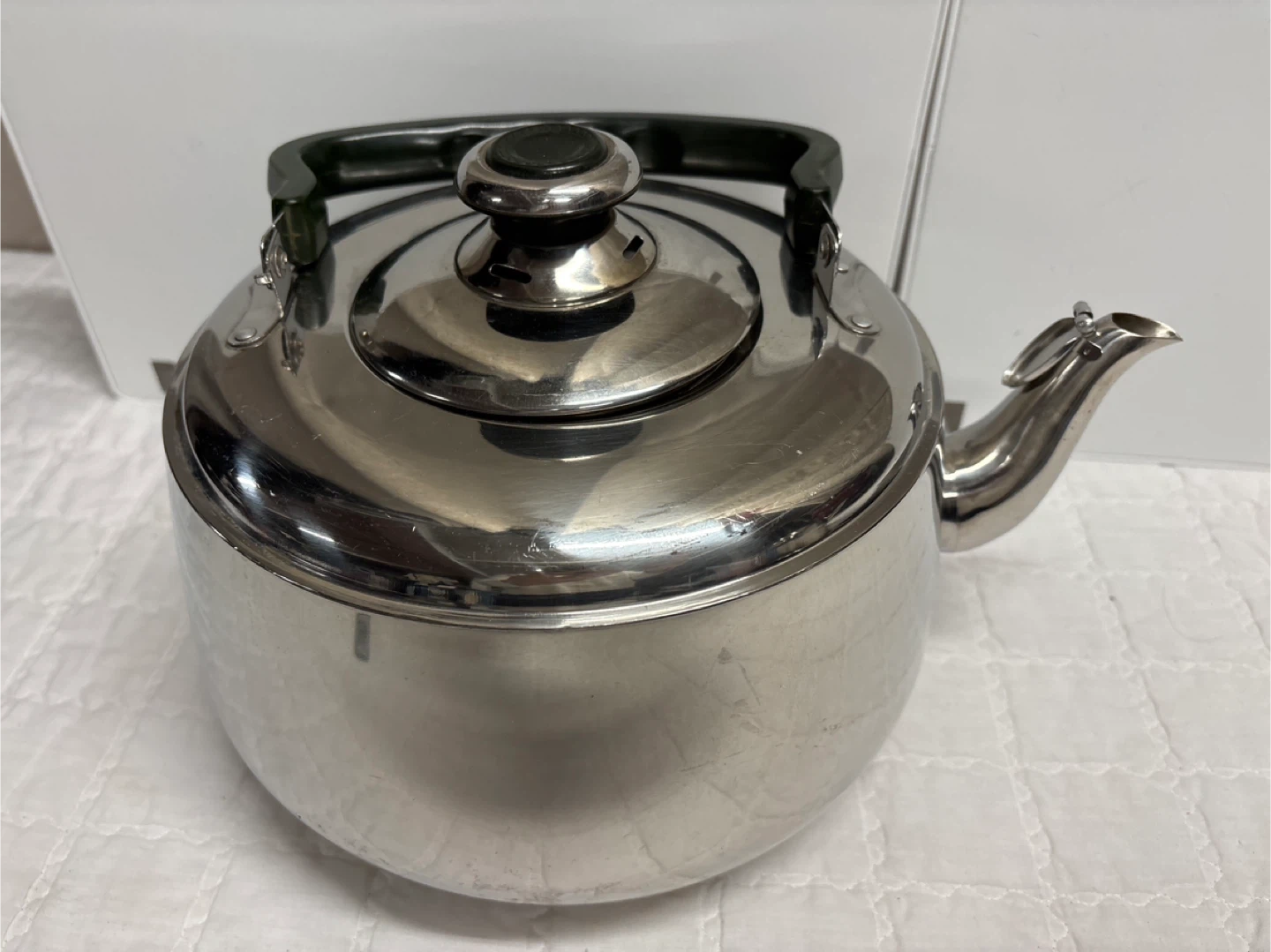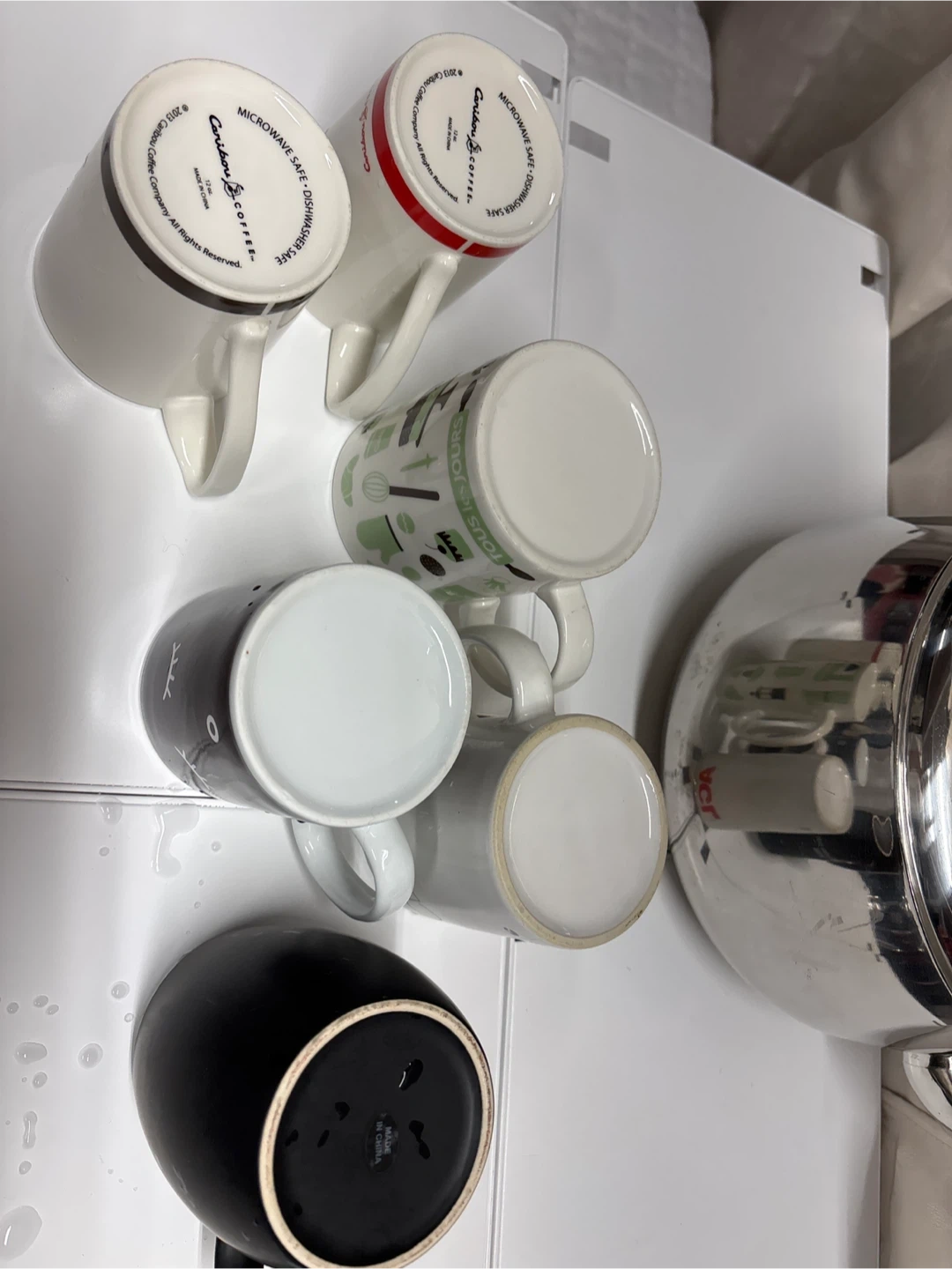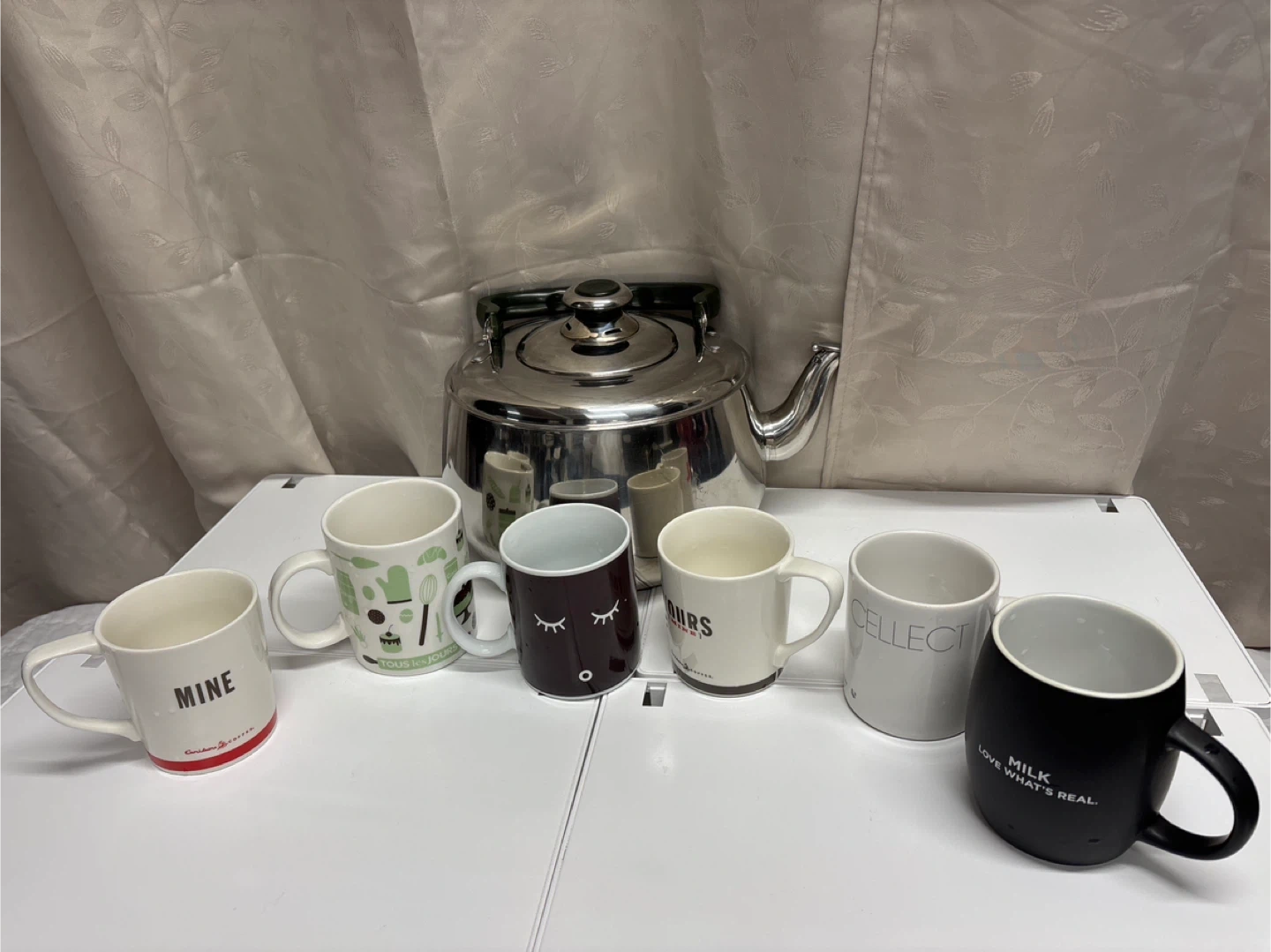 Selling a set of mugs and a stainless steel large kettle. The mugs feature various designs and are microwave safe. The kettle is made of stainless steel.