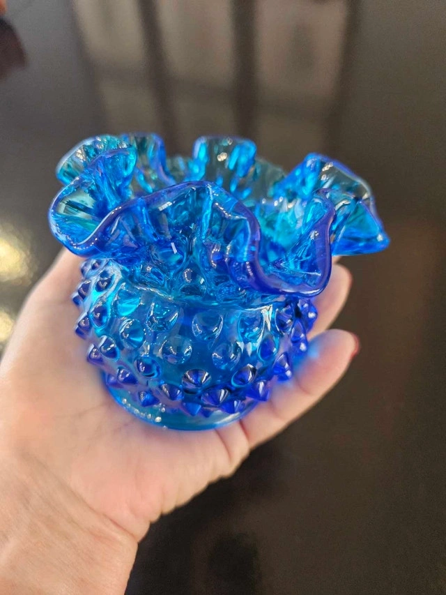 This is a beautiful, used Fenton blue ruffled hobnail candle votive or vase, perfect for adding a touch of vintage charm to any space.