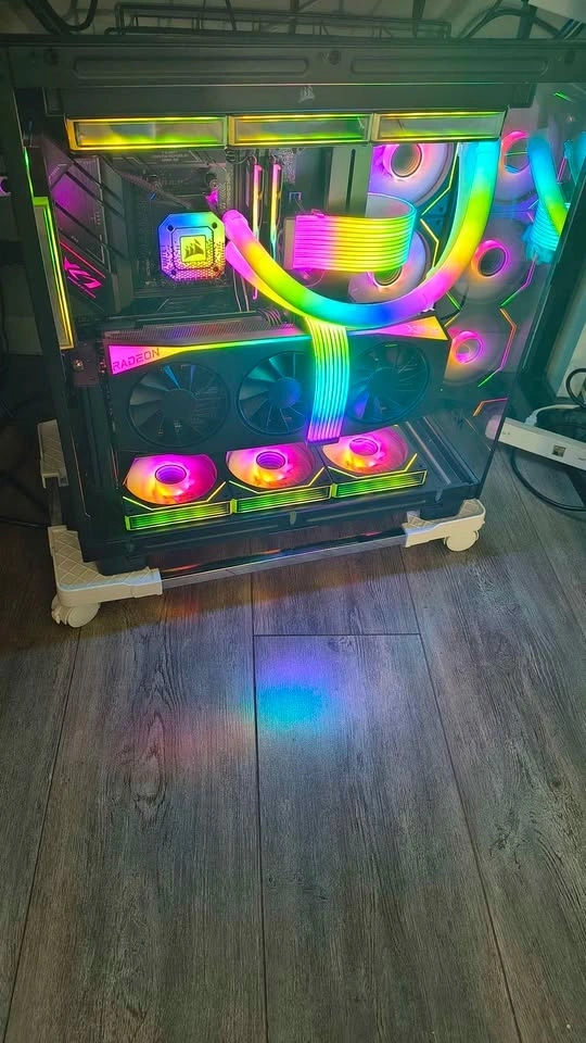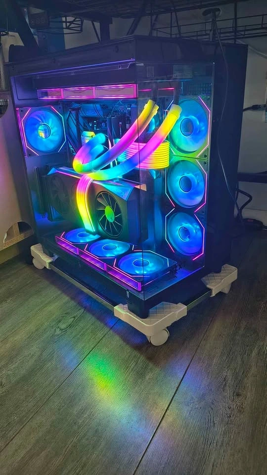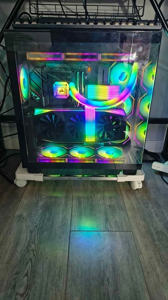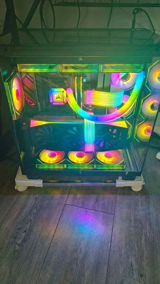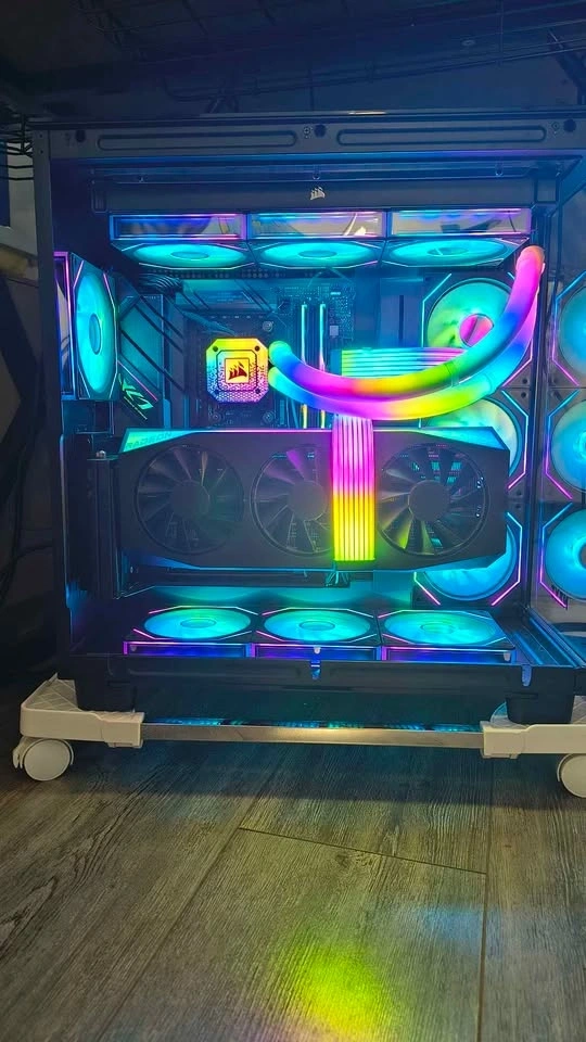 Extras: Additional Vertical GPU Mount Kit installed, 10 additional fans for a unified look, Strimer RGB cables, and RGB hubs. It looks absolutely stunning in person.