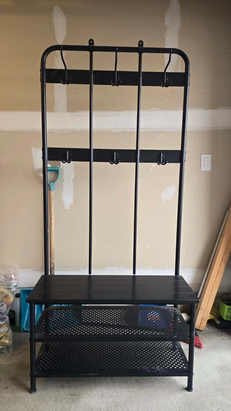 This black hall tree is a handy addition to your entryway. It features multiple hooks for coats and bags, a bench seat, and two shelves for shoe storage. Its metal construction offers durability.