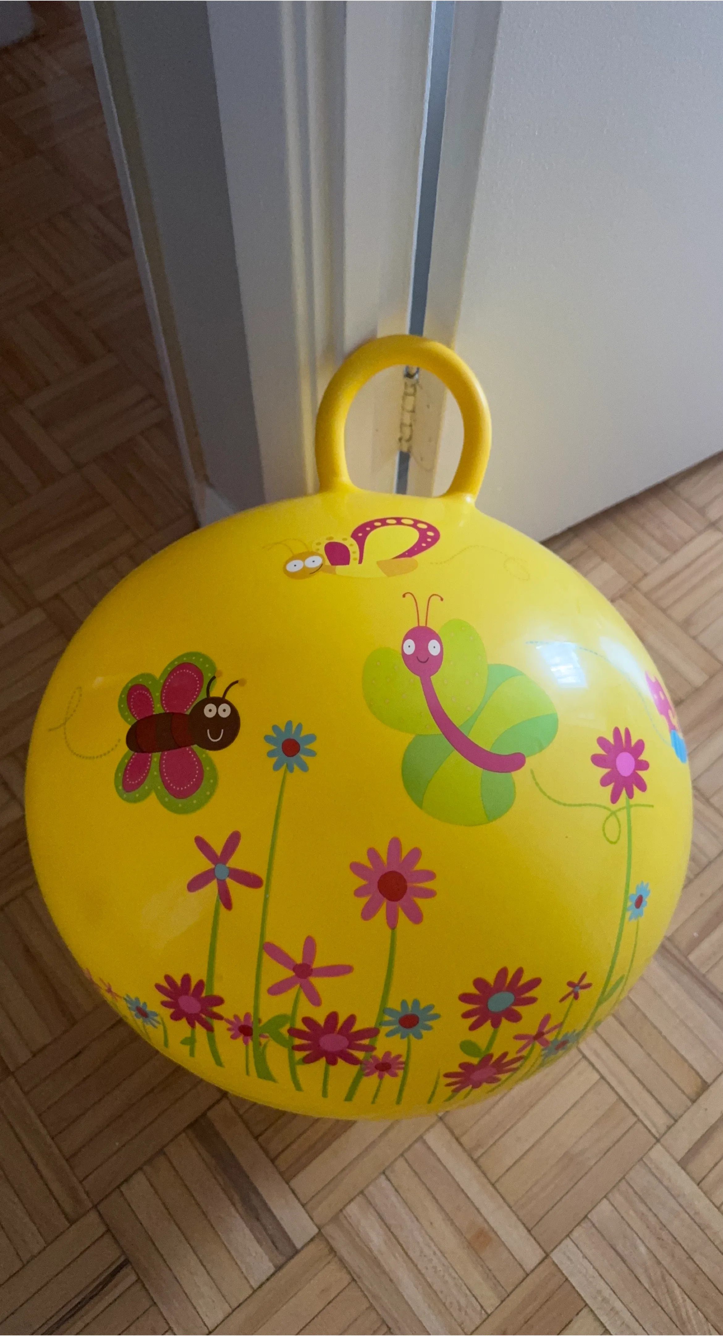 This is a fun, yellow hopper ball with a cute butterfly and flower design! It's perfect for kids who love to bounce around and get some exercise. It's in great condition and ready for a new home.