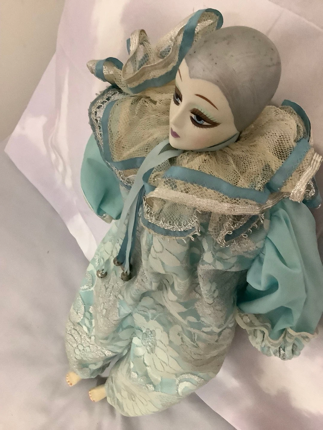 This is a charming porcelain jester doll. It's dressed in a light blue and silver satin costume with a ruffled collar. The doll has delicate painted features and a sweet expression.
