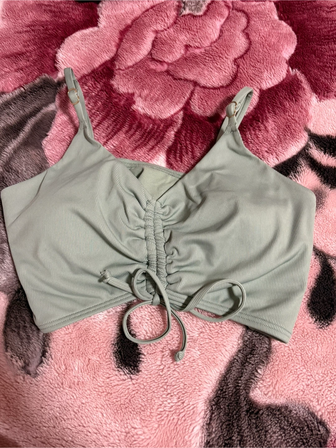 Here's a cute green ribbed top with a tie-front detail! Perfect for adding a pop of colour to your wardrobe! Size is M. Bathing suit. Purchased from La Vie En Rose.