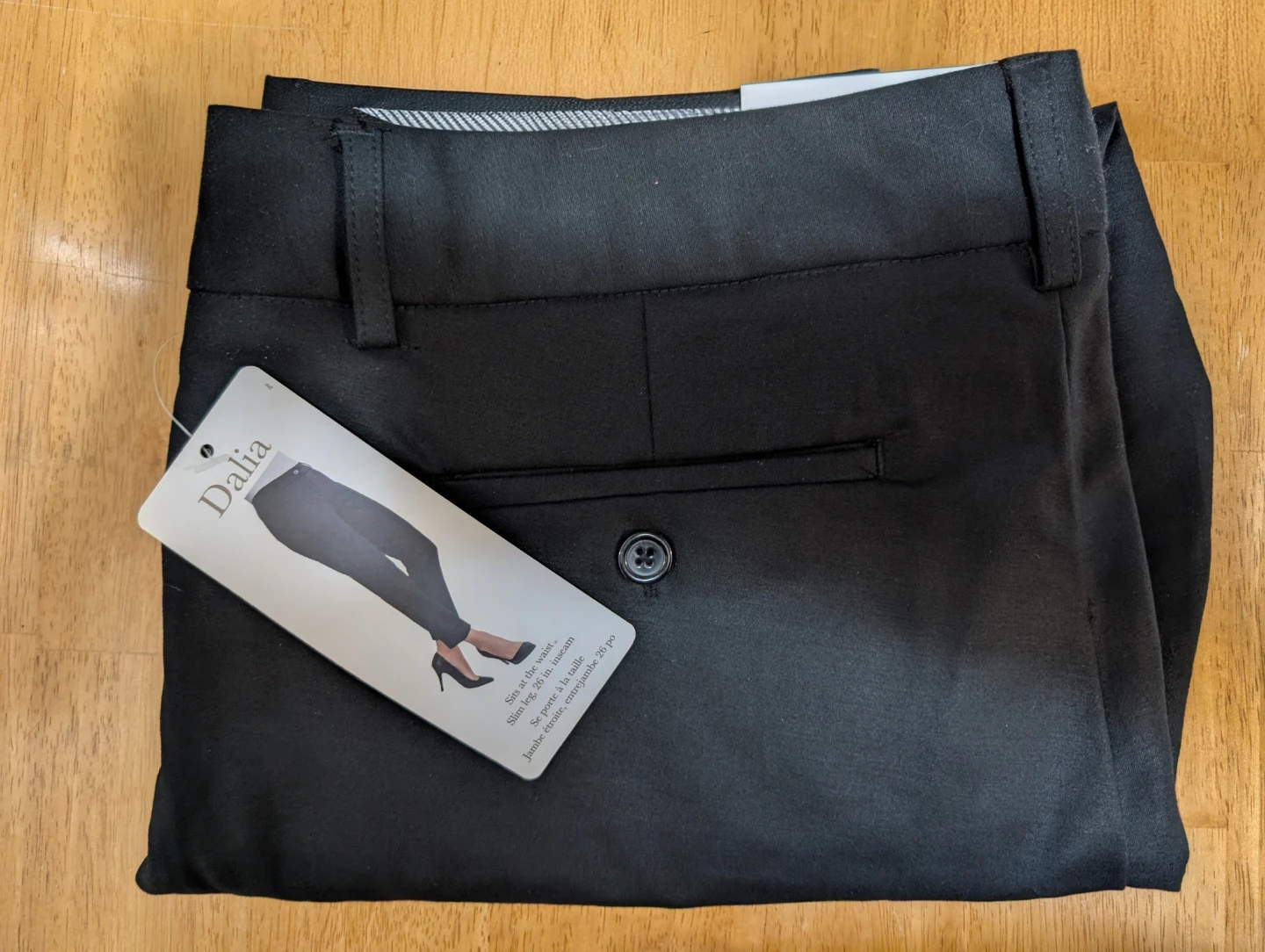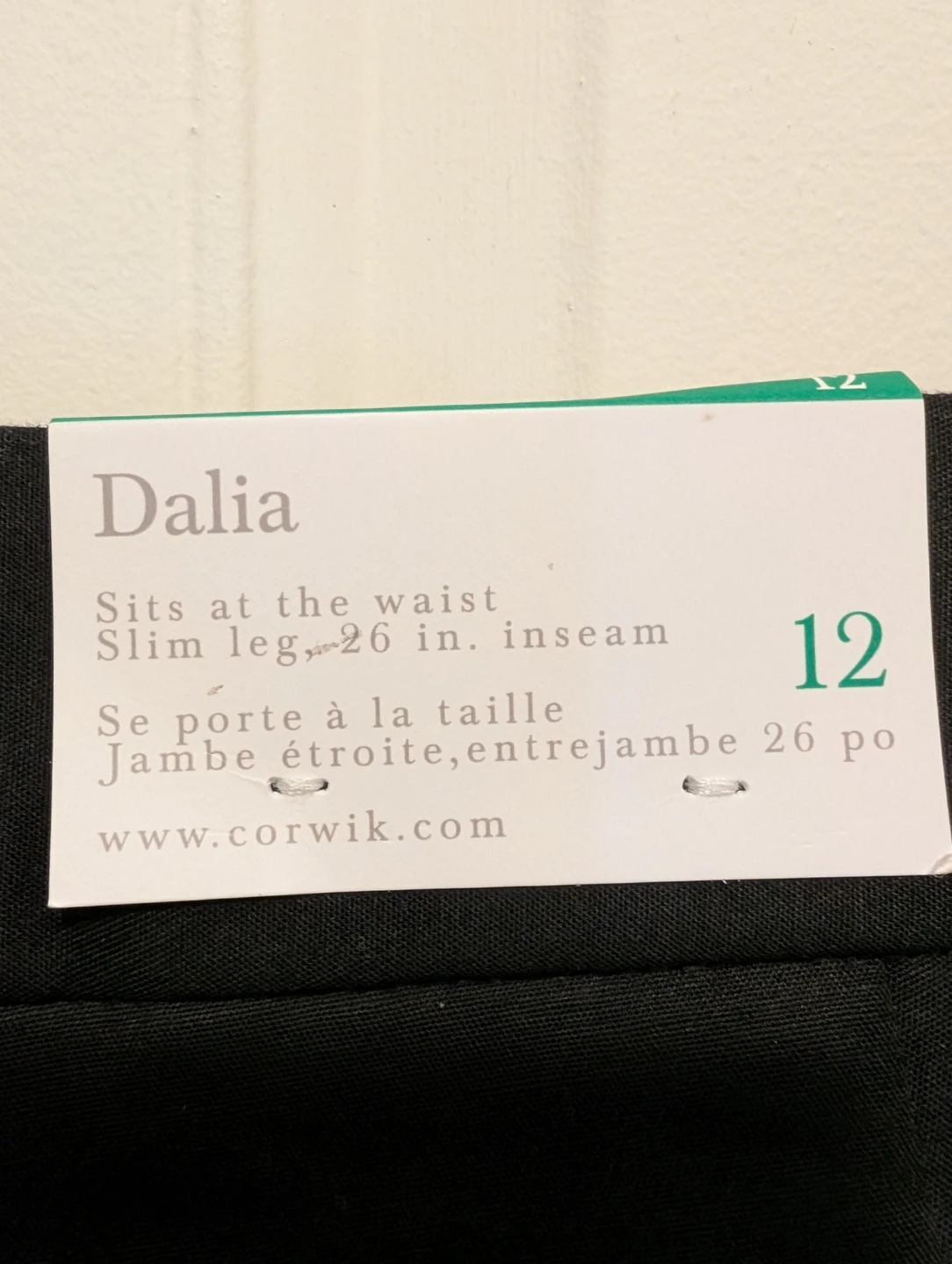 These women's Dalia black pants have a slim leg fit and a 26-inch inseam. They're made of 97% cotton and 3% spandex. They sit at the waist. These pants would be suitable for casual or dressy occasions!