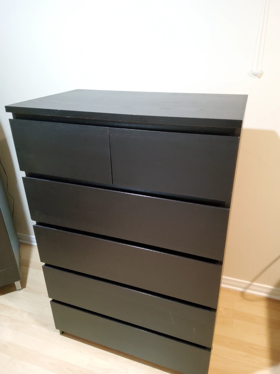 Selling a dark brown 6-drawer dresser. It's in good condition, perfect for adding storage to any room. The top surface is still great, and drawers work perfectly, but there's some wear on the left leg, as shown in the pictures.