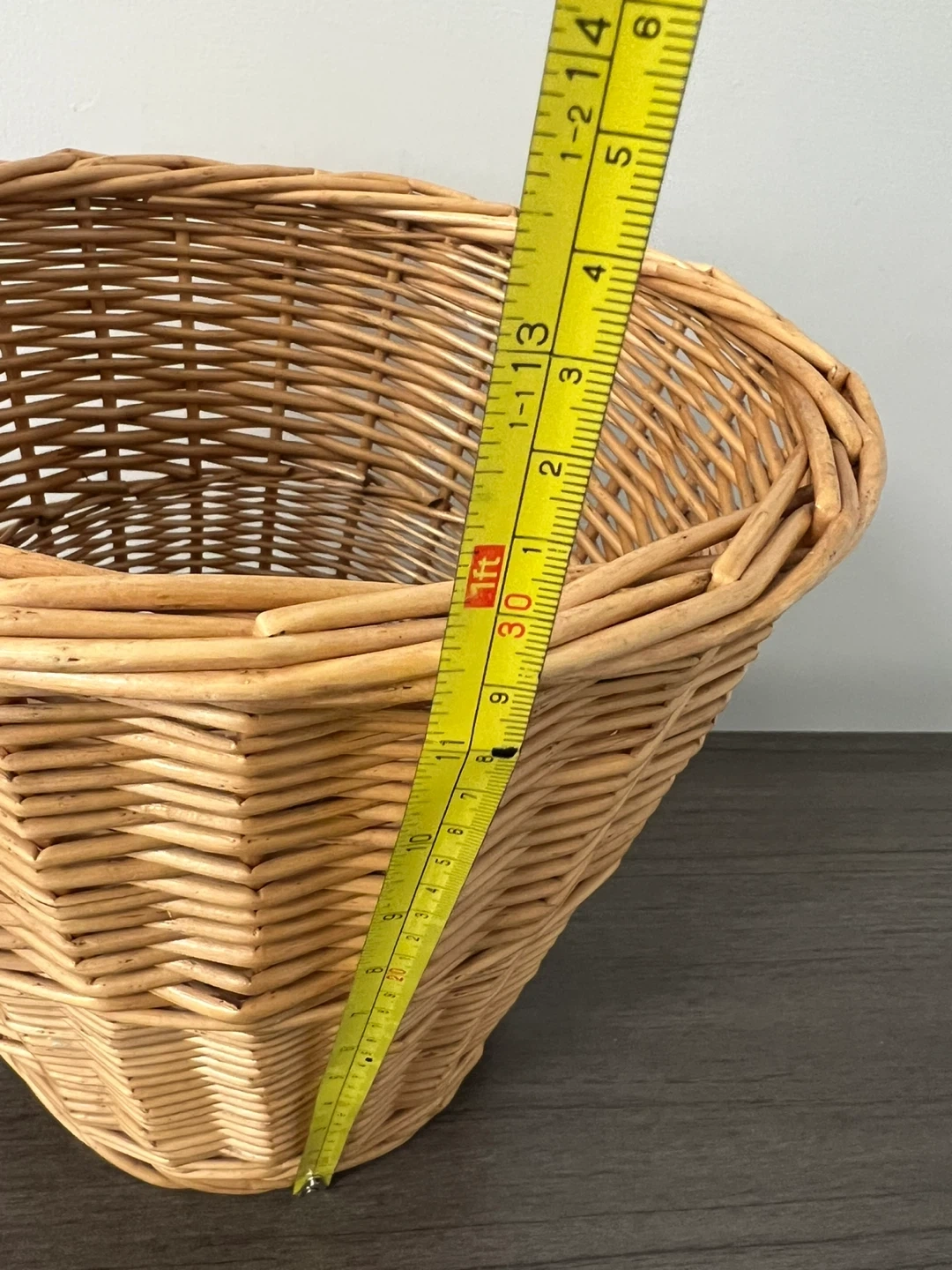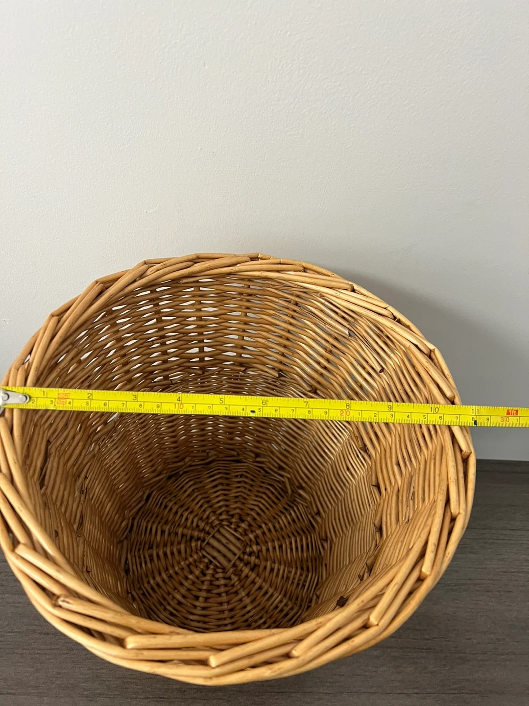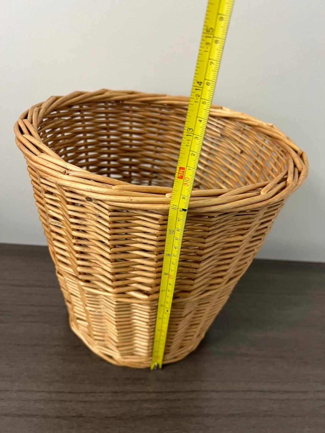 This is a natural wicker waste basket with a tapered shape. It measures approximately 12 inches in height and 10 inches in diameter at the top. It's a versatile storage solution for any room.