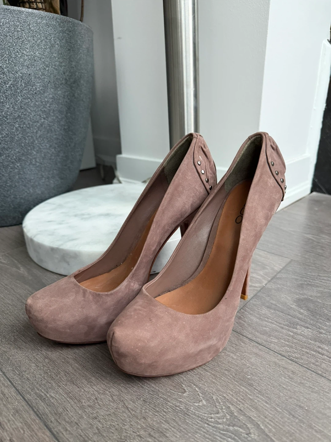 These ALDO heels are made from a dusty rose suede material. They feature decorative studs around the heel and a gathered detail at the back. These shoes are perfect for dressing up any outfit!