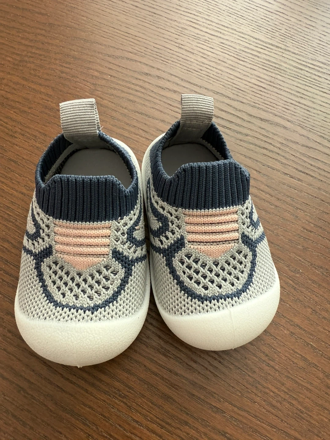 Toddler slip-on shoes with a grey knit upper and navy trim. Features a flexible sole and pull tab at the heel. Size is 11.5. It's a comfy choice for little walkers!