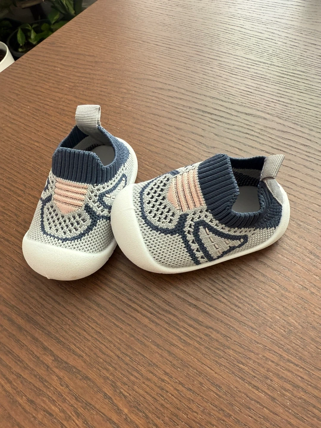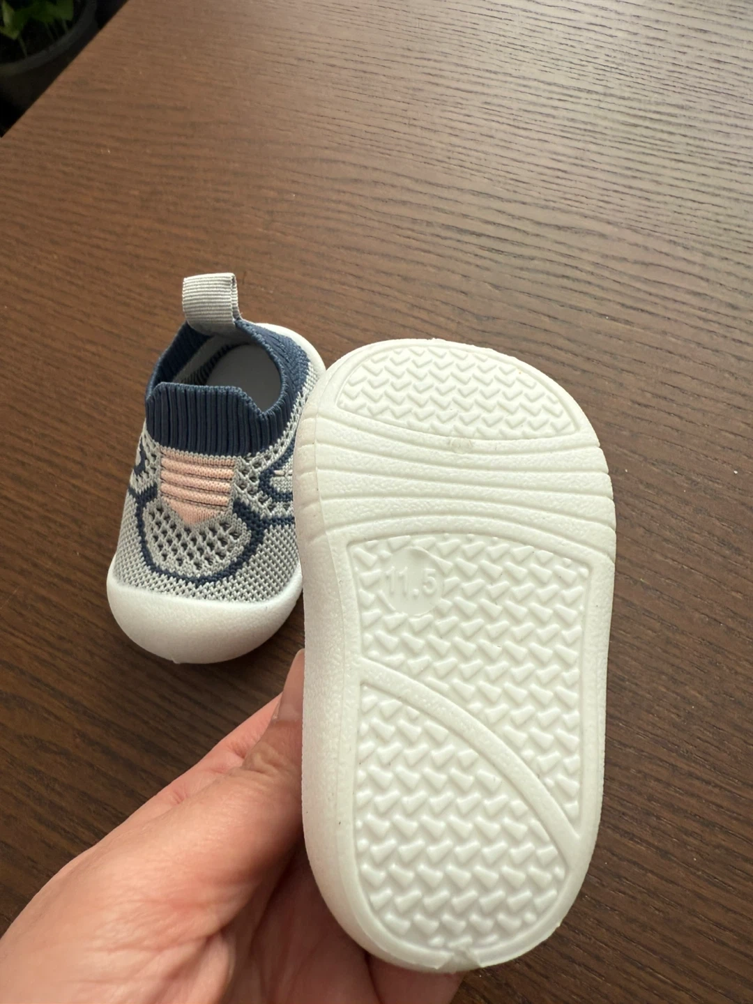 Toddler slip-on shoes with a grey knit upper and navy trim. Features a flexible sole and pull tab at the heel. Size is 11.5. It's a comfy choice for little walkers!