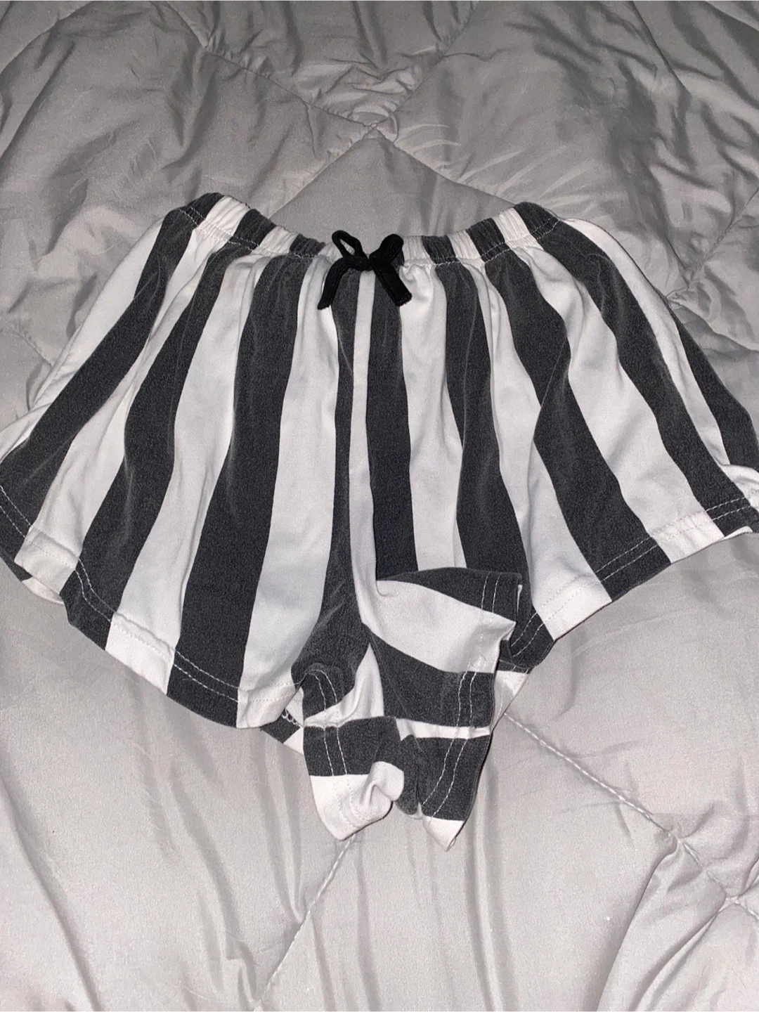 These comfy shorts feature a black and white stripe pattern. They have an elastic waistband with a black tie detail. Perfect for lounging!