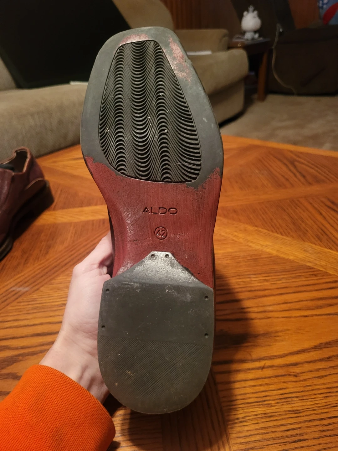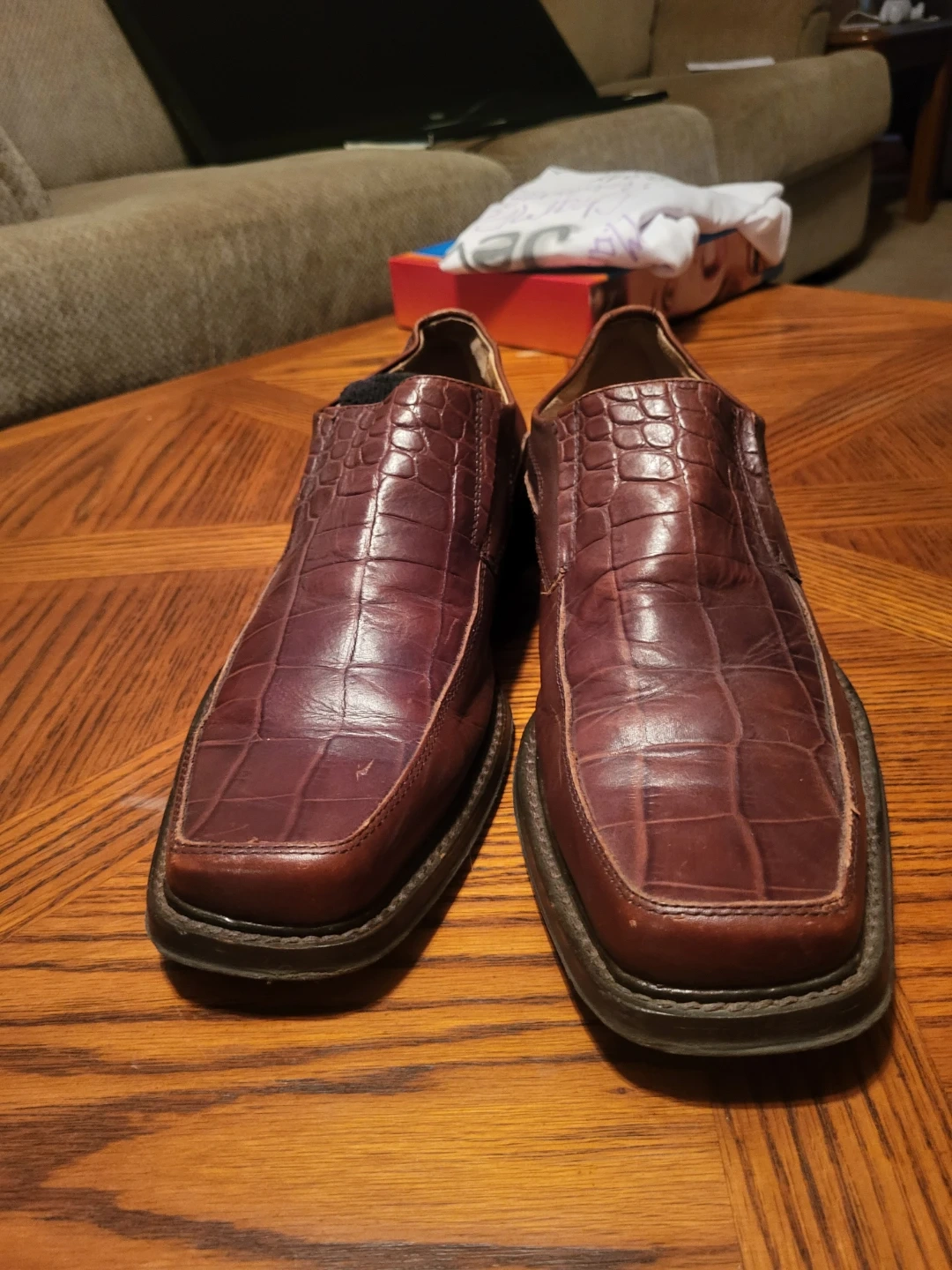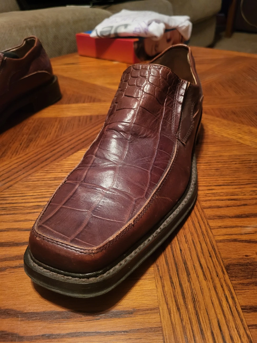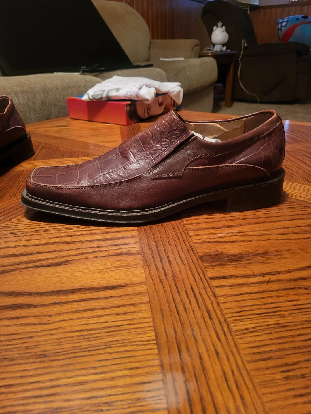 These are men's slip-on dress shoes by ALDO. They feature a burgundy colour with a crocodile embossed finish. The size is 42 (US 9). They're made for a stylish look and feel.