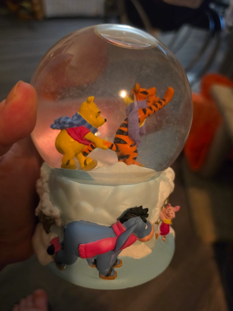 This charming snow globe features Winnie the Pooh and Tigger enjoying "Winter Fun." Eeyore and Piglet are also depicted on the base. A delightful collectible for Disney fans!