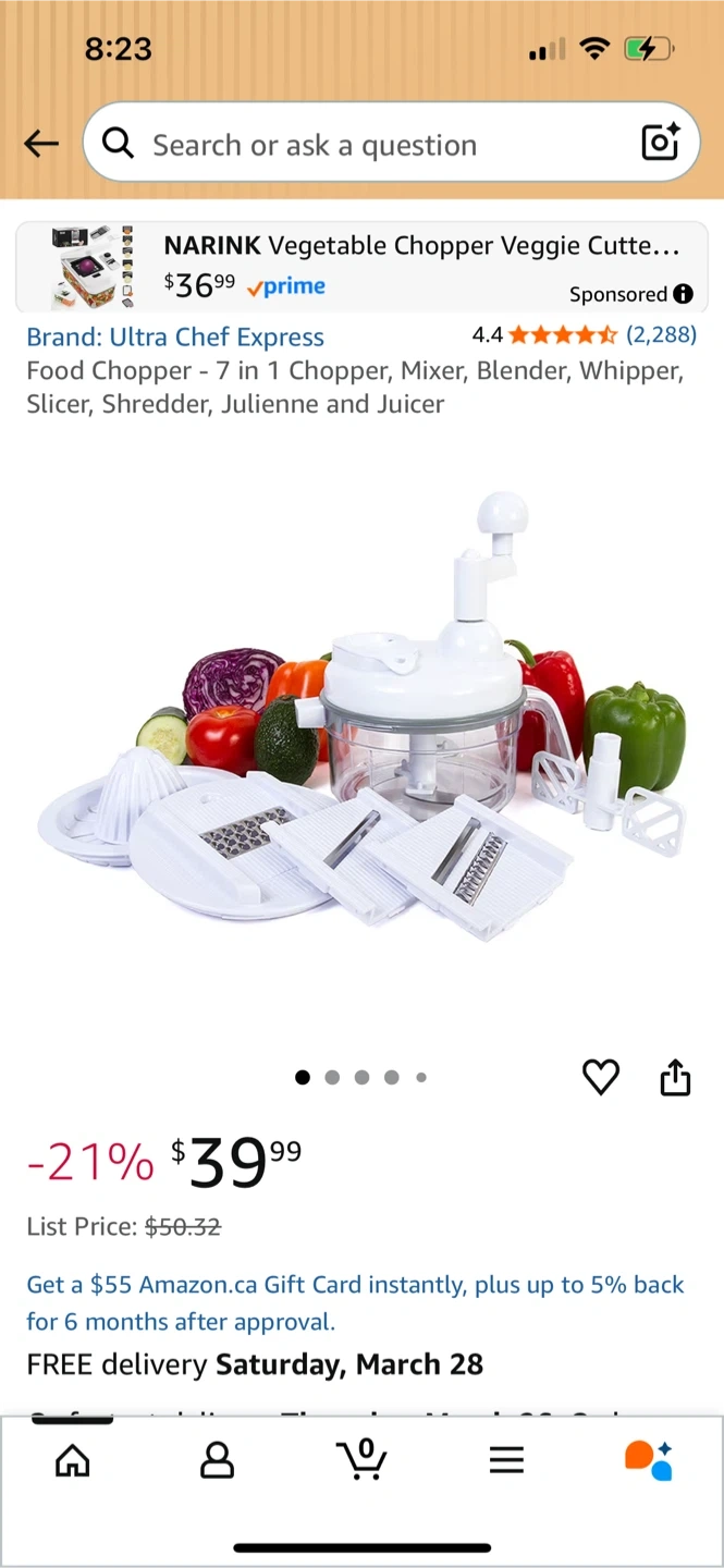 This white Ultra Chef Express food chopper is a 7-in-1 kitchen tool. It's designed for chopping, mixing, blending, whipping, slicing, shredding, and julienning. Multiple attachments are included for various food preparations.