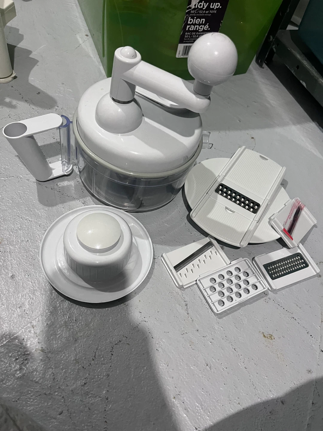 This white Ultra Chef Express food chopper is a 7-in-1 kitchen tool. It's designed for chopping, mixing, blending, whipping, slicing, shredding, and julienning. Multiple attachments are included for various food preparations.