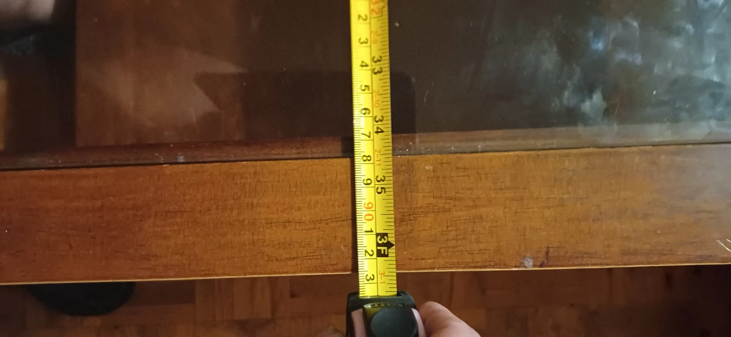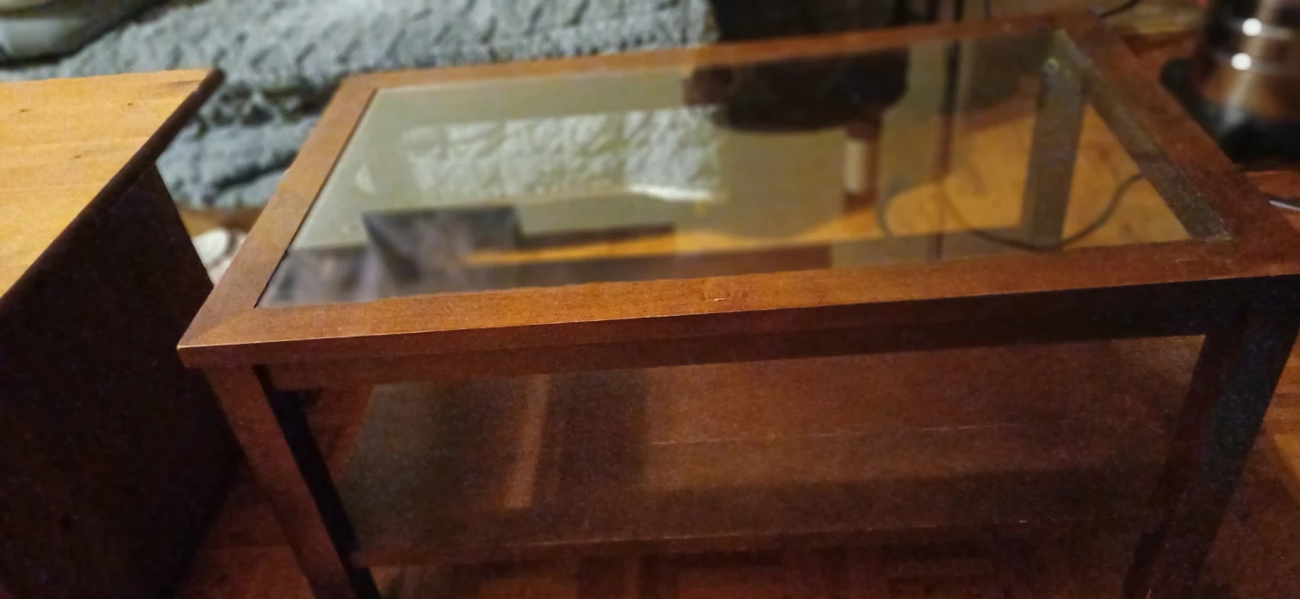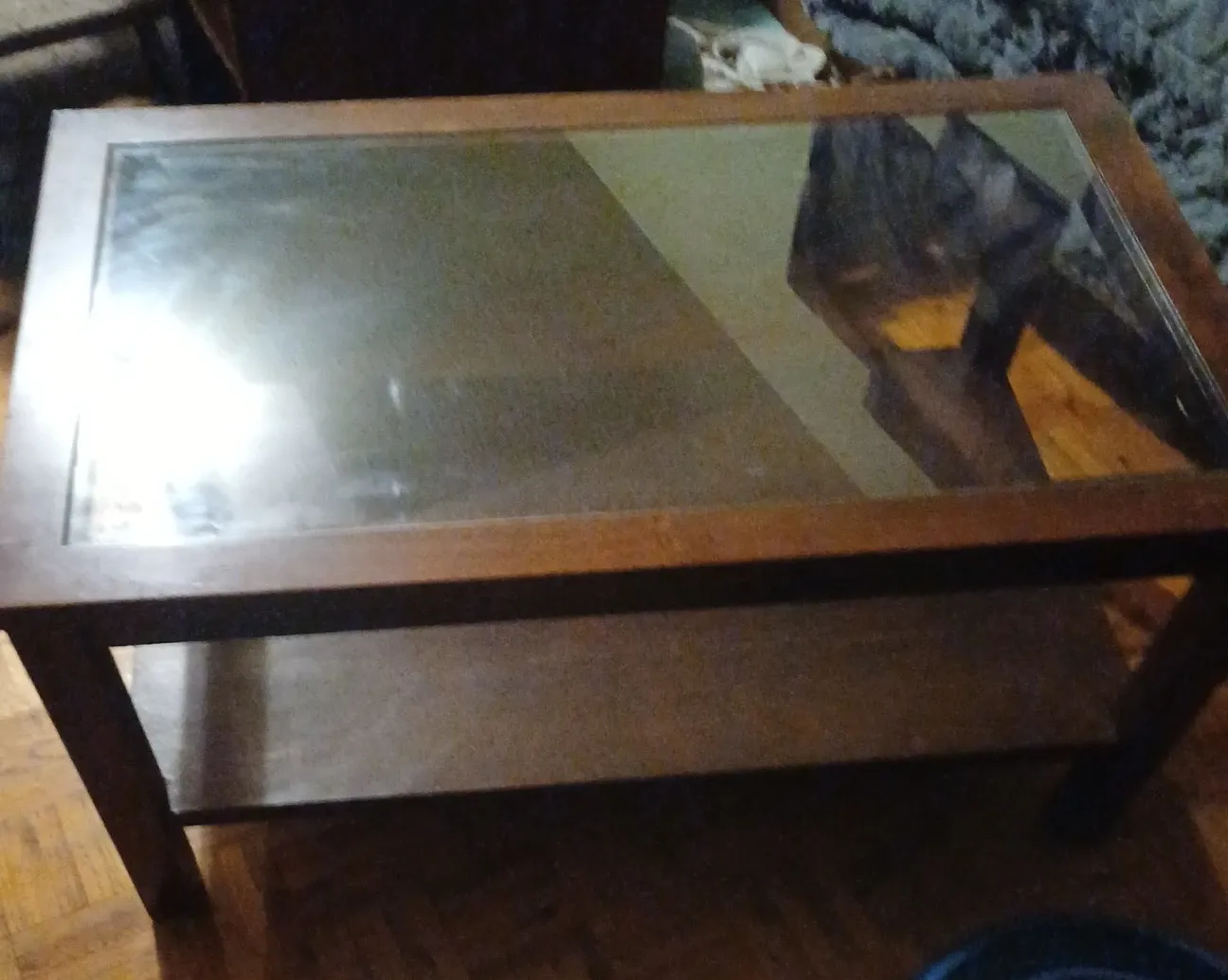 This coffee table has a wooden frame and a glass top surface. It includes a lower shelf for extra storage. The wood's warm tone and the glass top make it a versatile addition to any living space. A nice spot for drinks and decor!