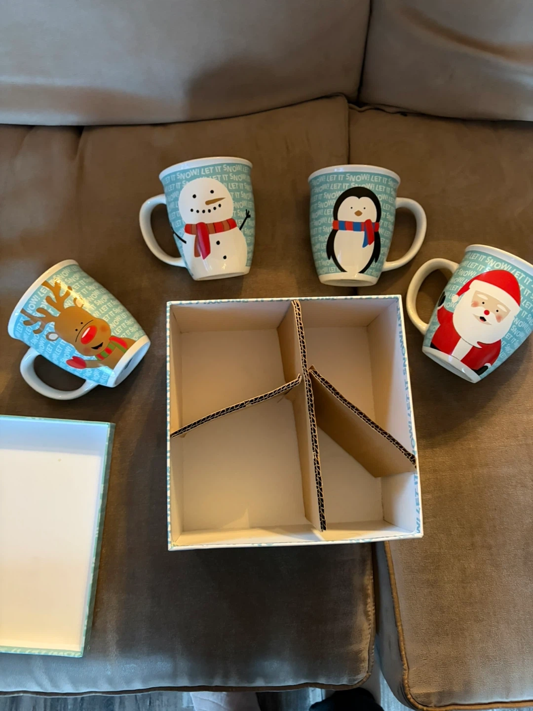 Buy & SellSet of 4 Christmas MugsSet of 4 Christmas Mugs$8Includes four festive mugs featuring Santa, a snowman, a penguin, and a reindeer. Made for holiday enjoyment!ConditionNewWHERE TO MEETCheck LocationView MapSELLERDebbieBrooklin202 reviews0 chats·0 favorites·2 viewsSEND CHAT TO SELLERHi Debbie! I’m interested in your listing.Hi Debbie! I’m interested in your listing.Get the Karrot app to chatSign In to chat