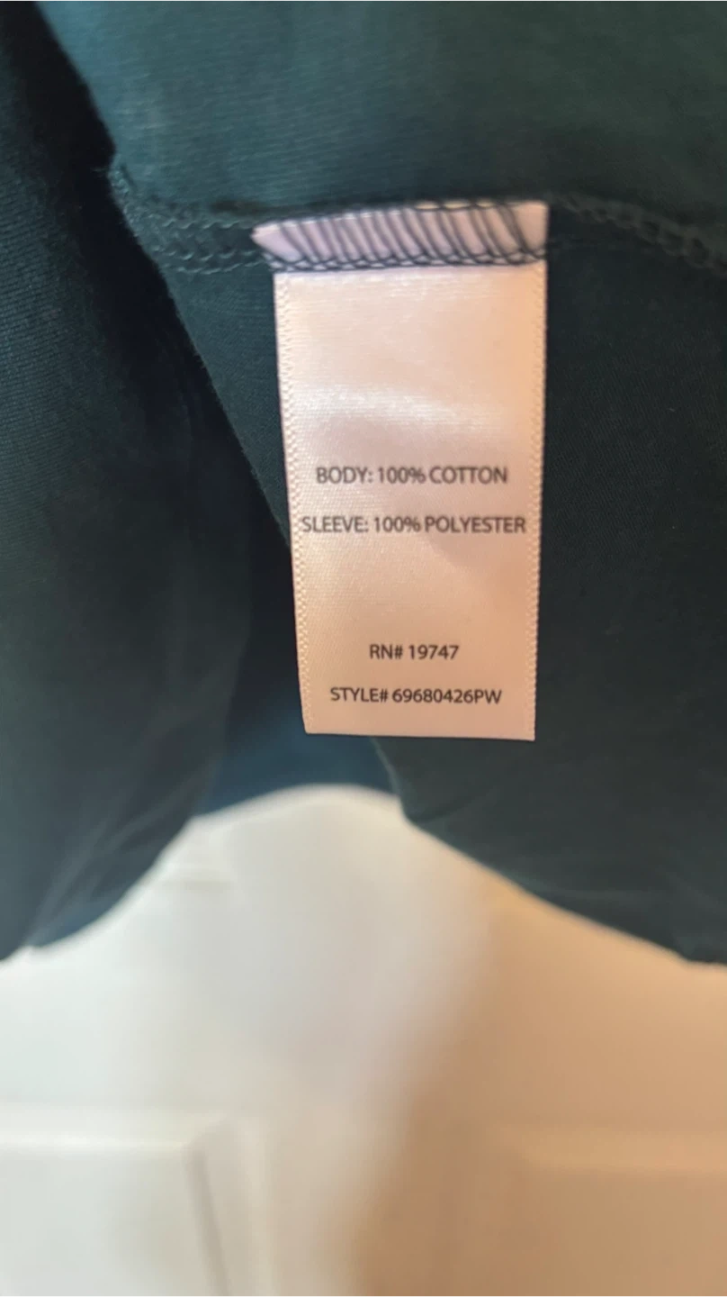 This is a teal-coloured top from The Pioneer Woman in size M. The body is 100% cotton and the sleeves are 100% polyester. It has a floral pattern on the sleeves.