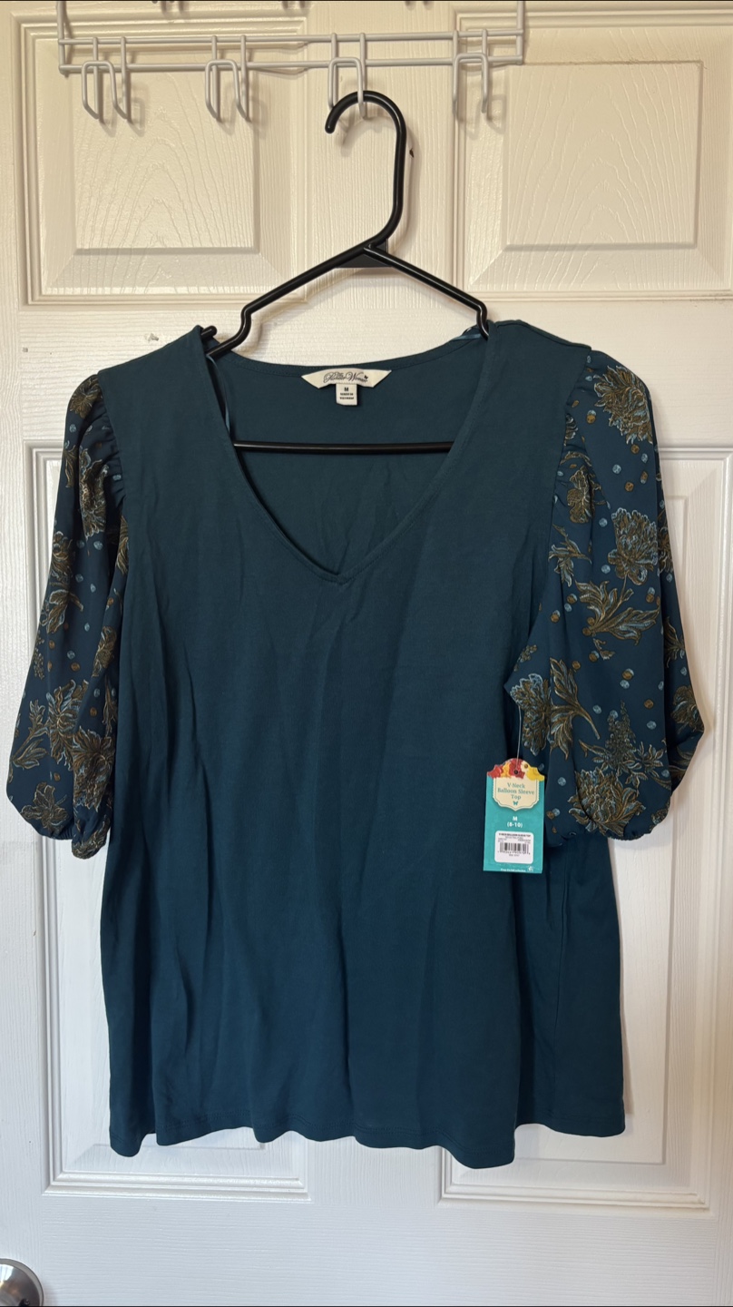 This is a teal-coloured top from The Pioneer Woman in size M. The body is 100% cotton and the sleeves are 100% polyester. It has a floral pattern on the sleeves.
