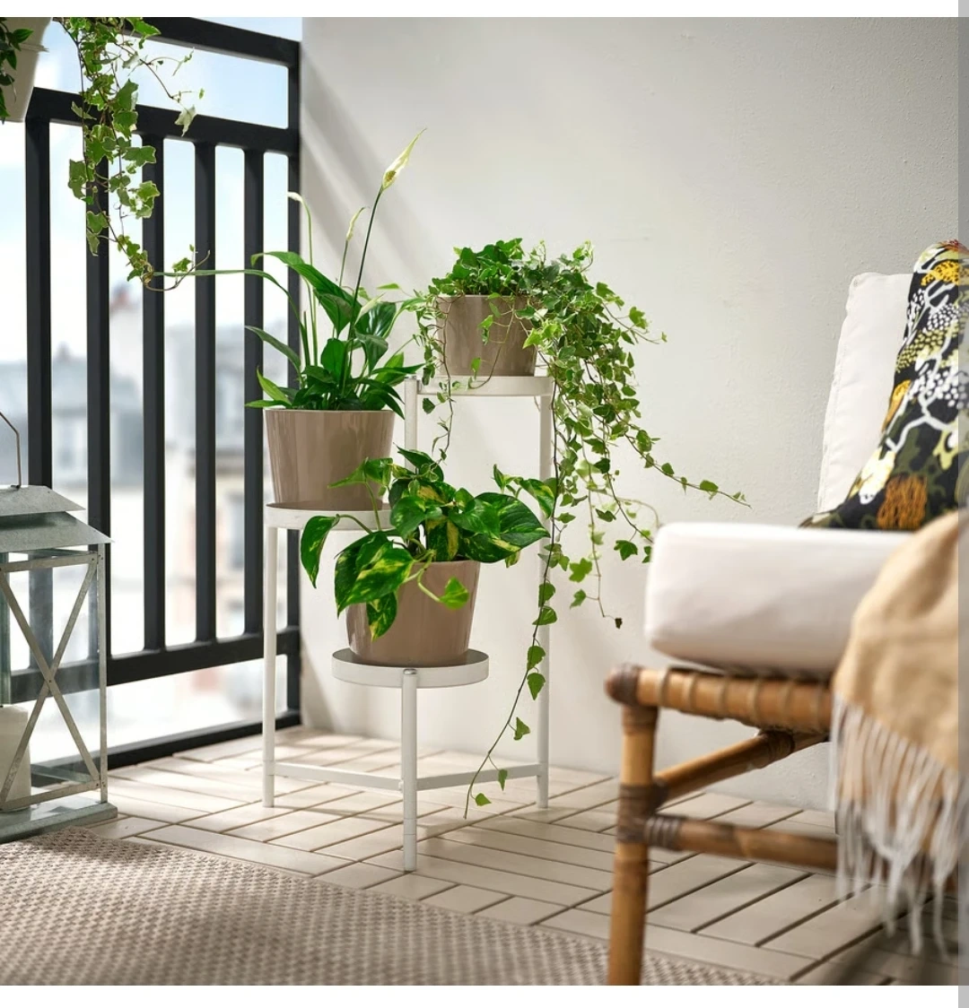 This is the IKEA OLIVBLAD plant stand. It's an off-white colour and suitable for indoor or outdoor use. The stand is 58 cm (22 3/4") tall and has three tiers for displaying plants. It's a limited edition item!