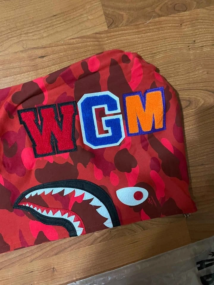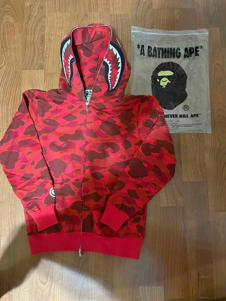 Bape Full Zip-Up Shark Hoodie. Red. Size M. Brand new with tags. Cash only. Meetup at the Planet Fitness Plaza in Pickering (2460 Brock Rd, Pickering, ON L1X 2R2).