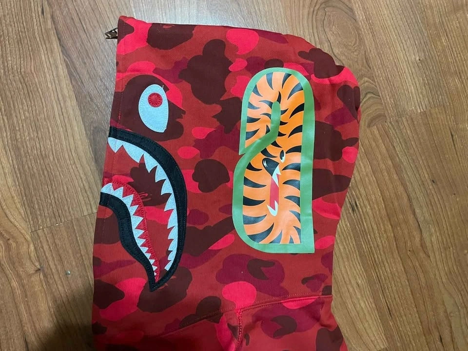 Bape Full Zip-Up Shark Hoodie. Red. Size M. Brand new with tags. Cash only. Meetup at the Planet Fitness Plaza in Pickering (2460 Brock Rd, Pickering, ON L1X 2R2).