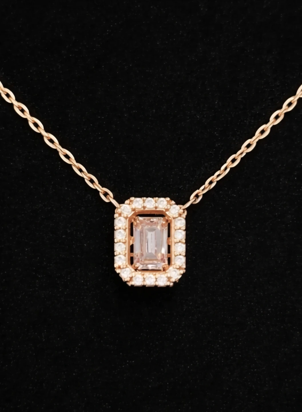 This is a Swarovski pendant necklace with a rose gold tone finish. It features an emerald-cut pink stone surrounded by smaller clear crystals. The necklace comes with its original Swarovski box and care instructions. Like New.