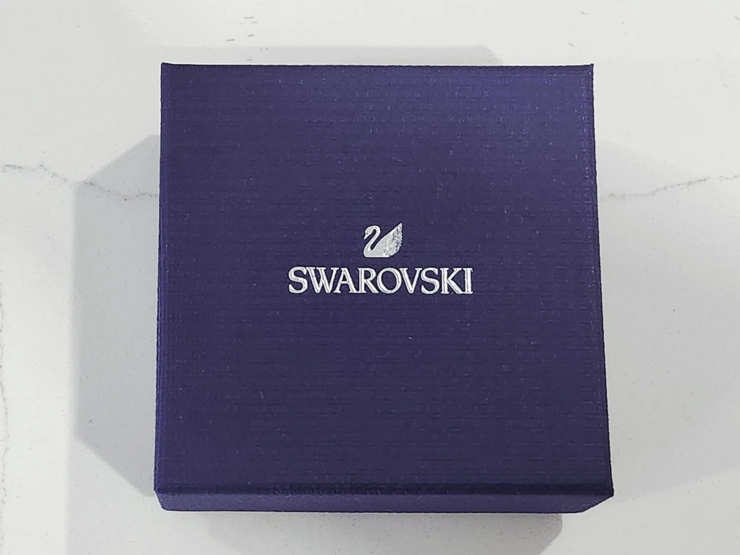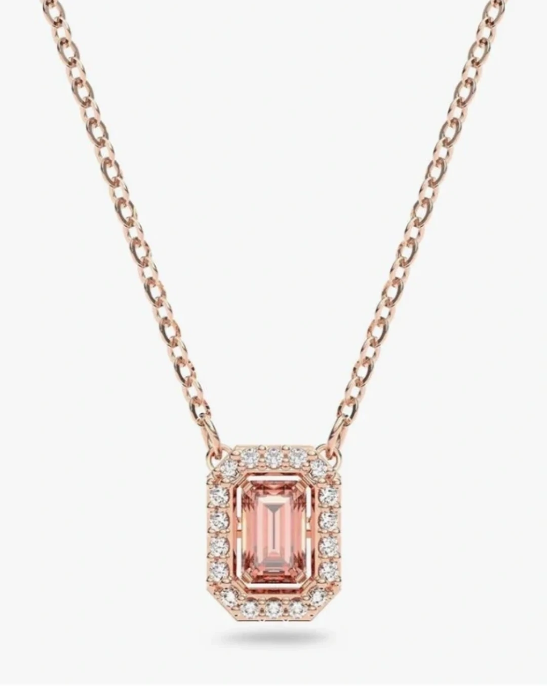 This is a Swarovski pendant necklace with a rose gold tone finish. It features an emerald-cut pink stone surrounded by smaller clear crystals. The necklace comes with its original Swarovski box and care instructions. Like New.