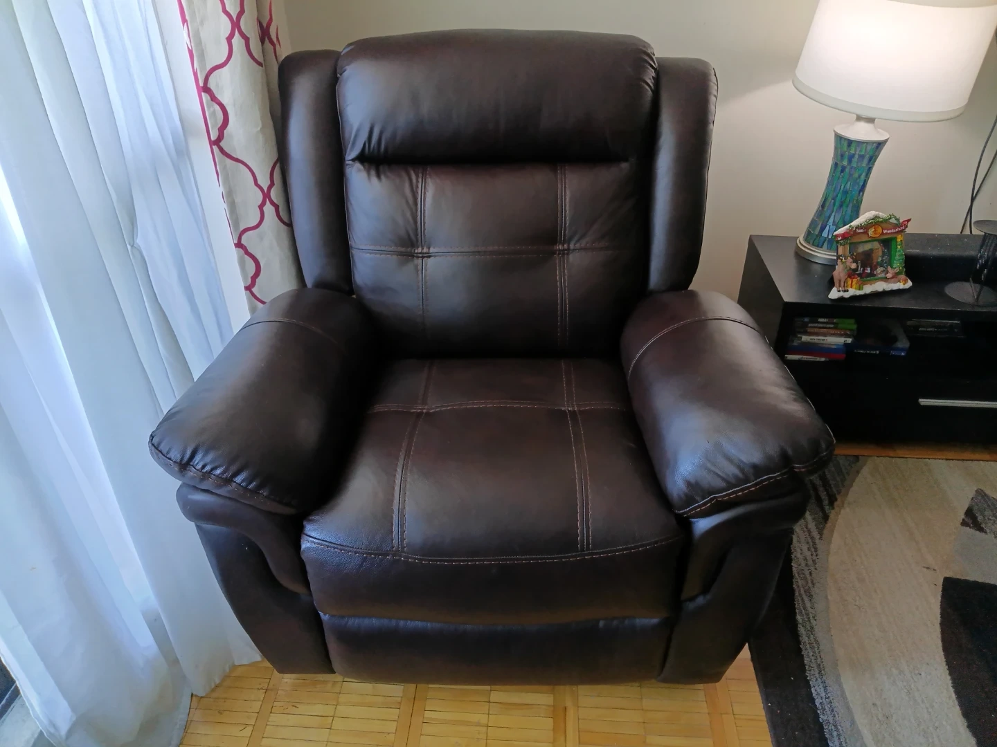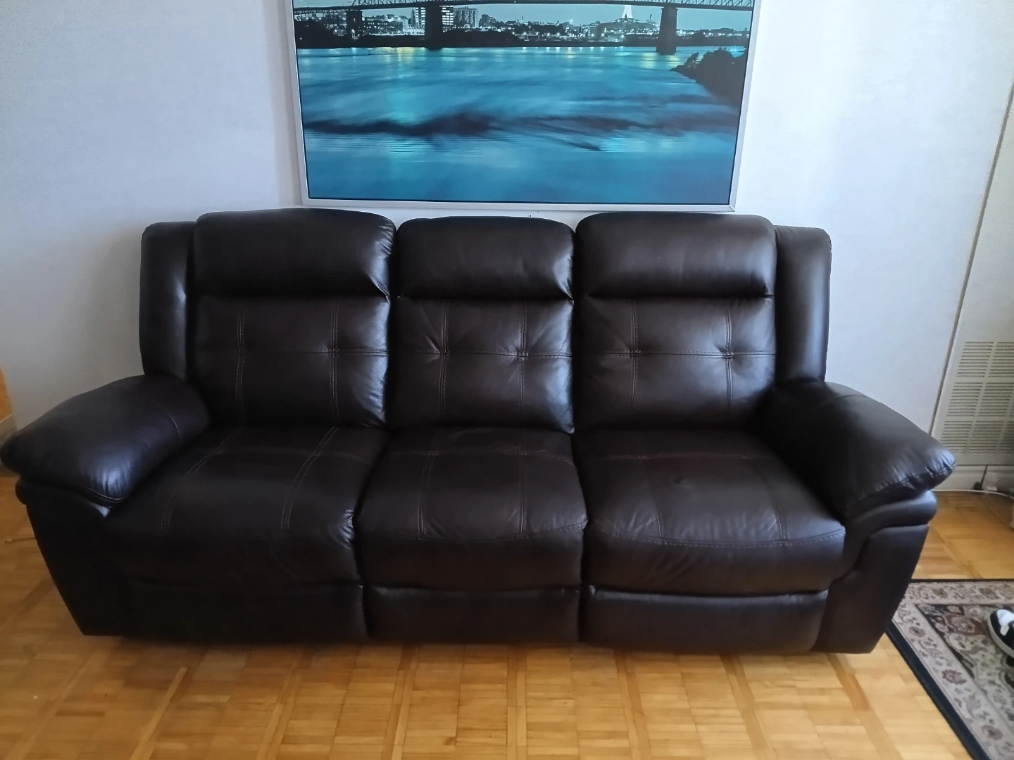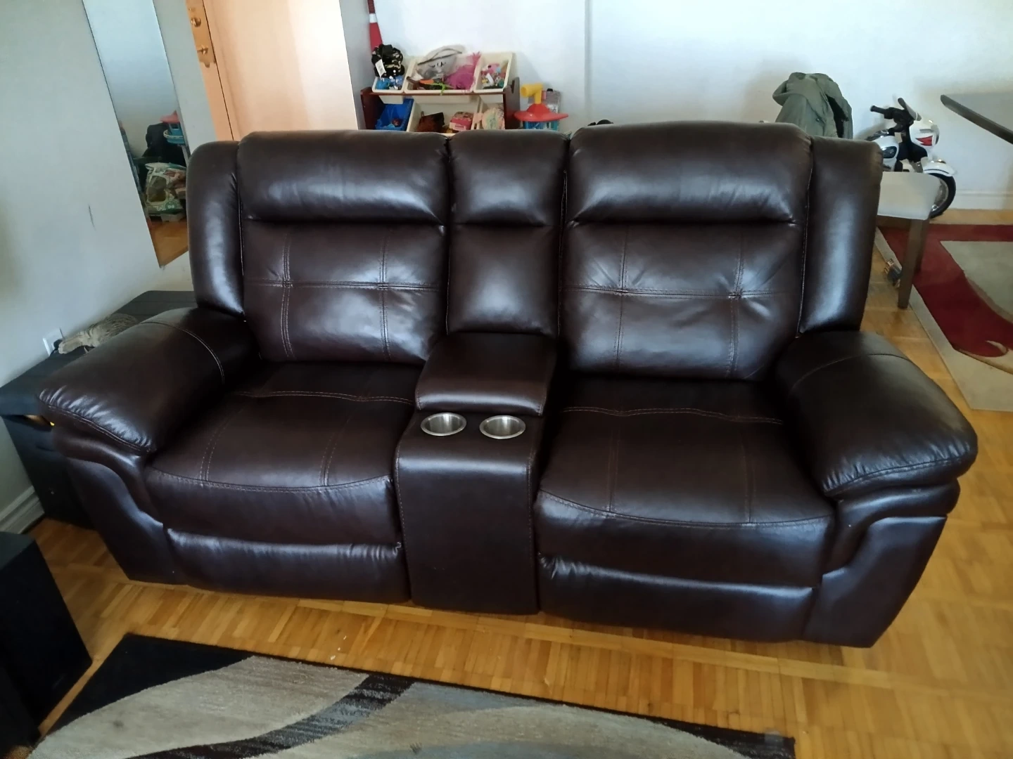This is a dark brown leather reclining sofa set. It features plush cushioning and a centre console with cup holders. Great for movie nights!