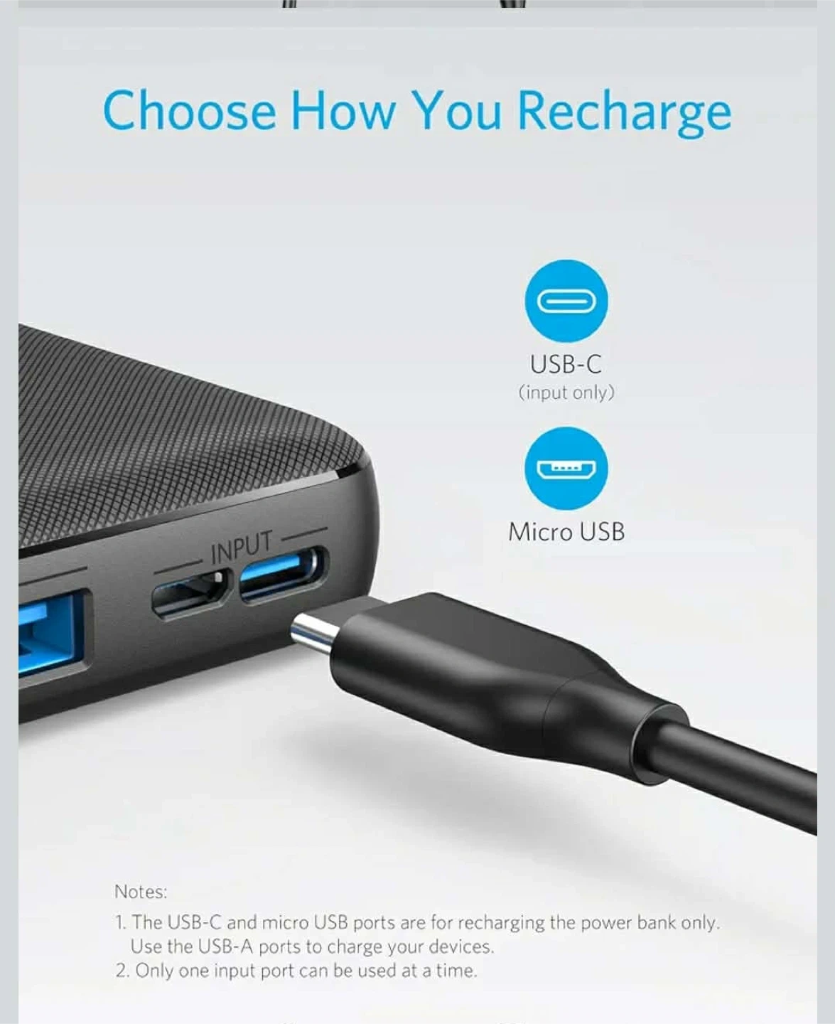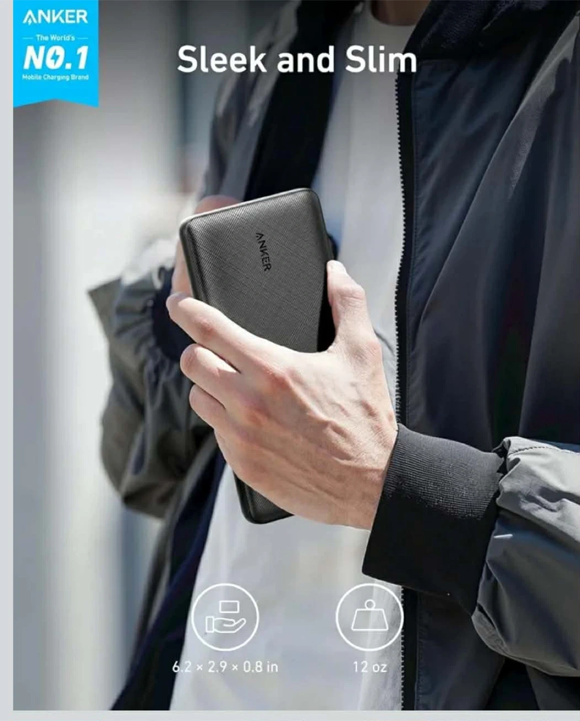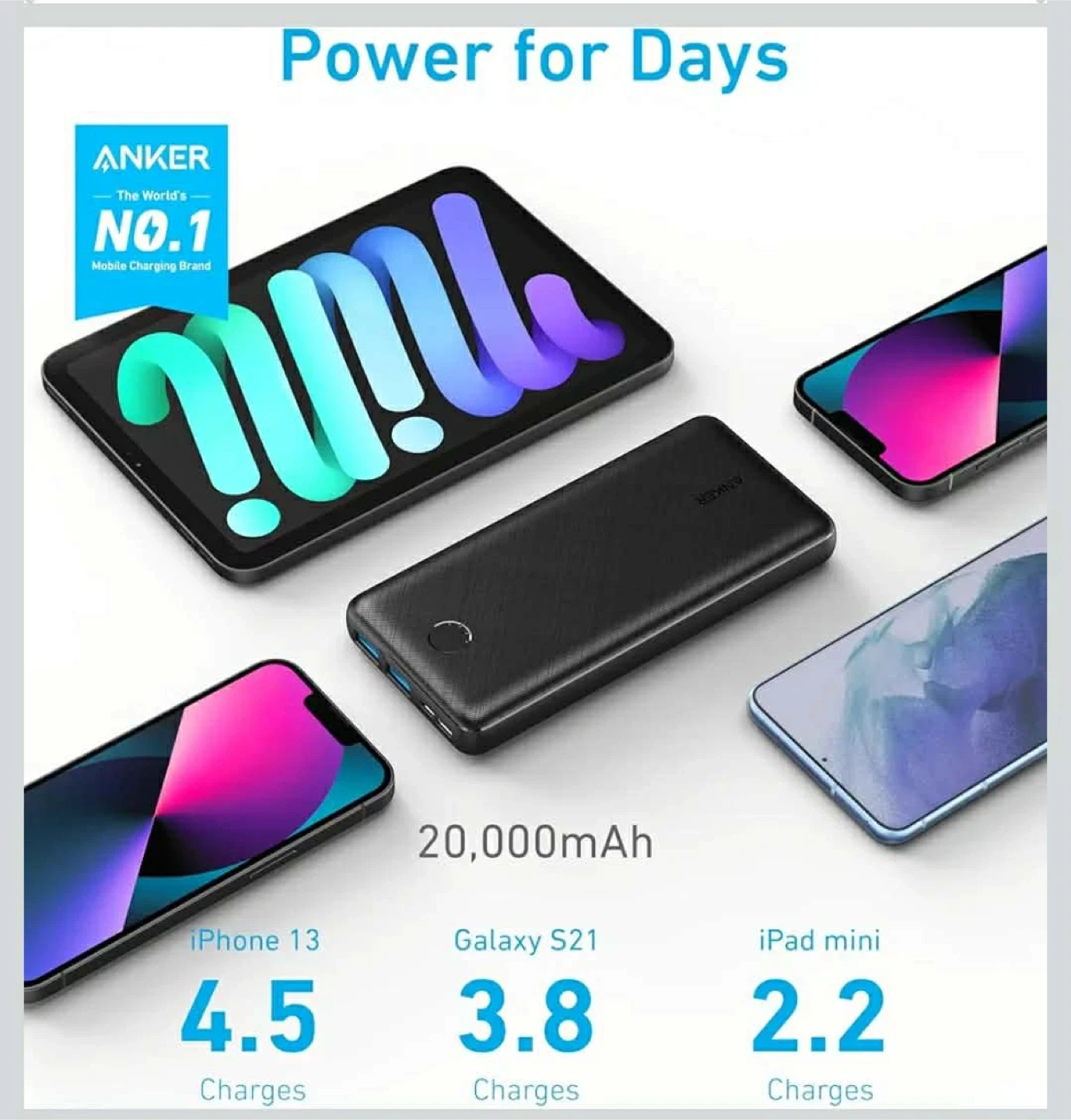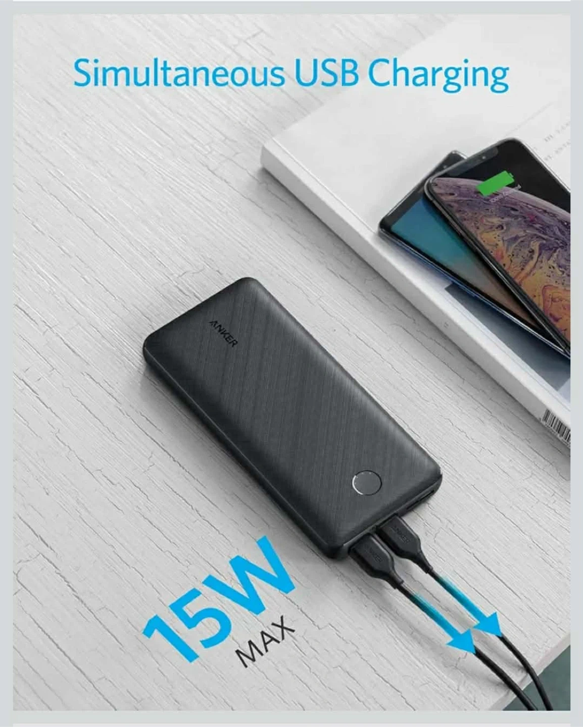 This Anker PowerCore Essential power bank has a 20,000mAh capacity. It offers 20% faster charging for iPhones and features PowerIQ and VoltageBoost technology. Multiple USB-A ports allow for simultaneous charging with a 15W maximum output.