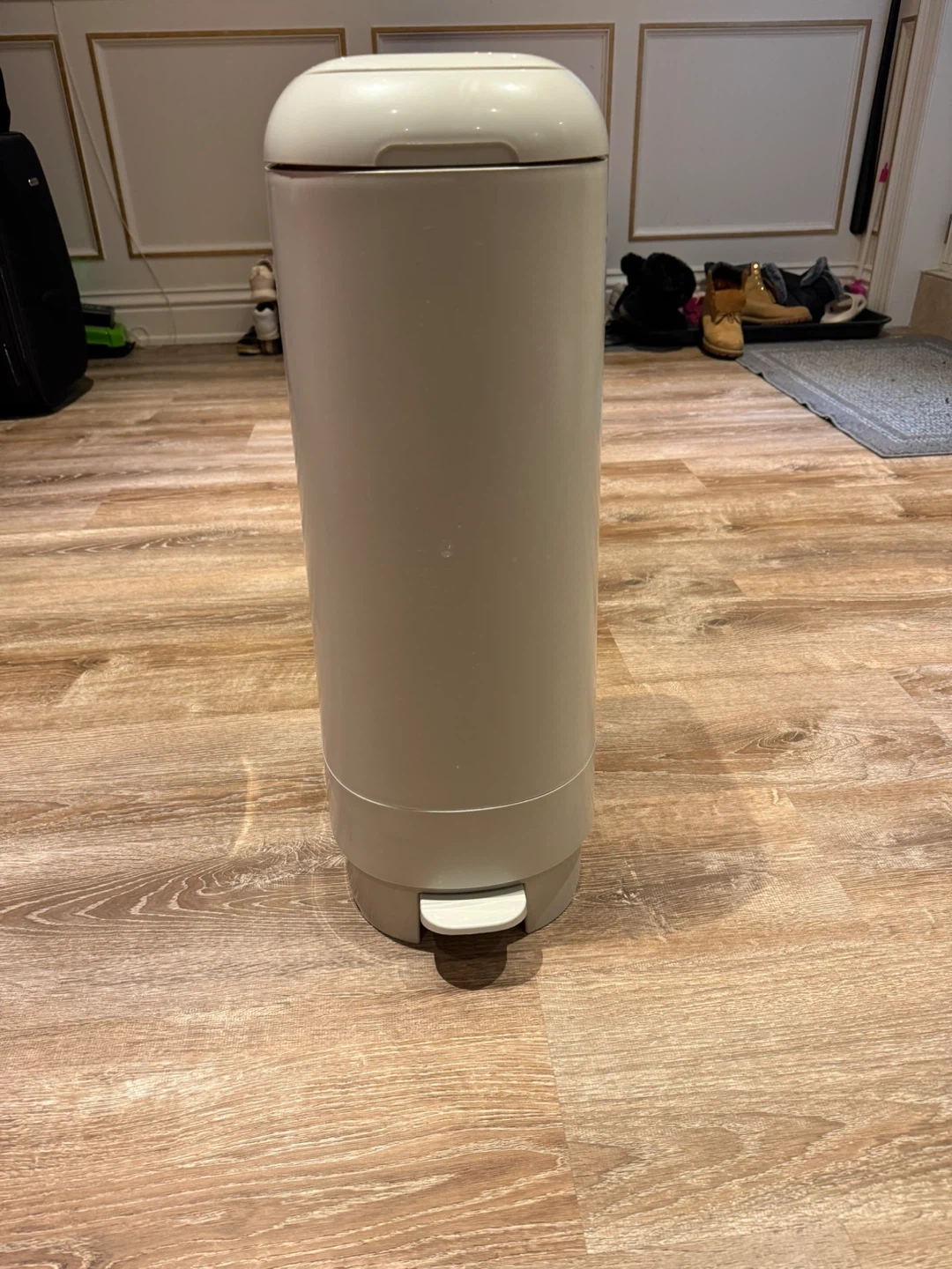 This is a Diaper Genie Signature diaper pail. It's a neutral grey colour. Easy foot pedal operation for hands-free use. Comes with a starter refill ring.