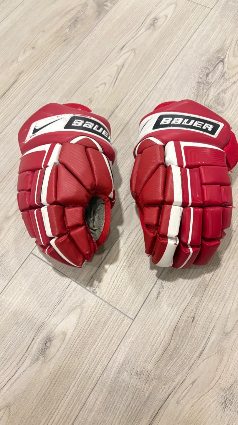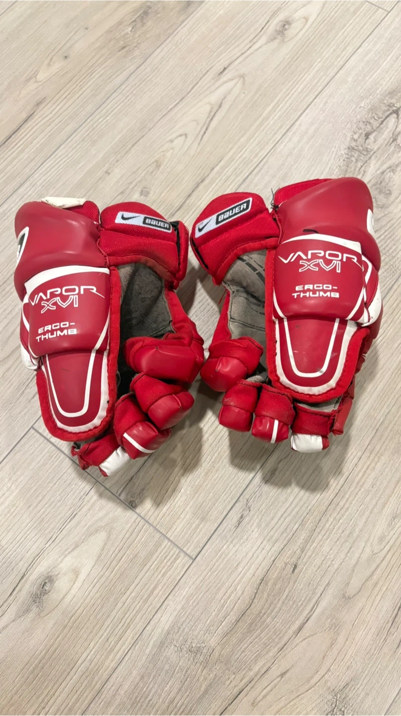 These Bauer Vapor XVI hockey gloves are red and white. They feature an ERGO-THUMB design for improved grip and control. Great for players looking for a reliable pair of gloves for the game!