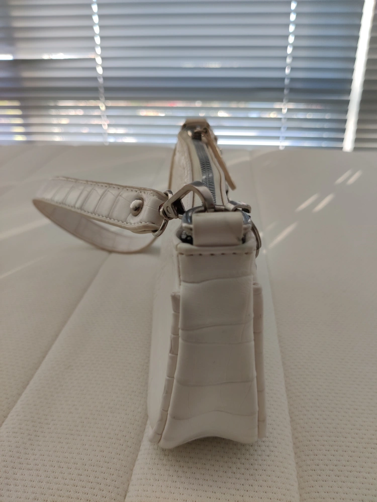 Small white handbag with crocodile embossed material, featuring a chain strap with a leather shoulder strap. Very stylish!