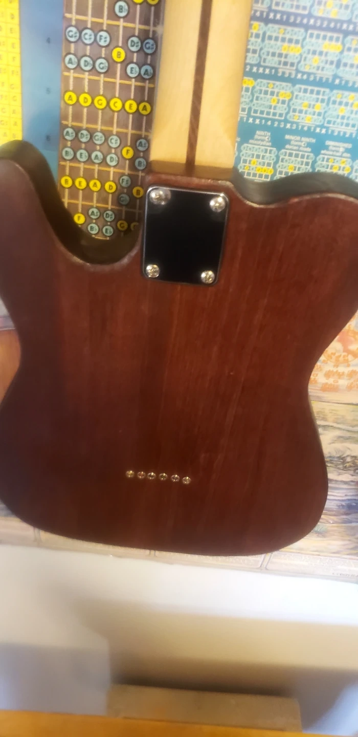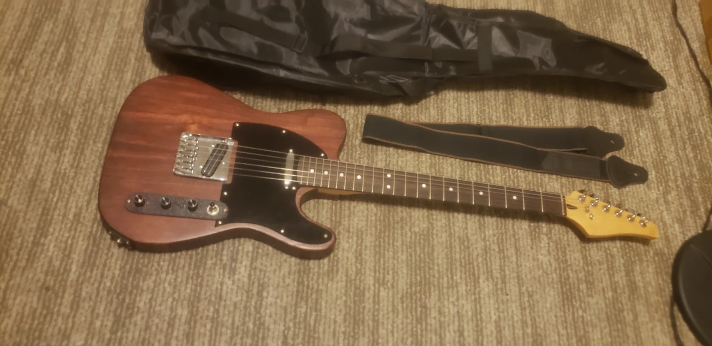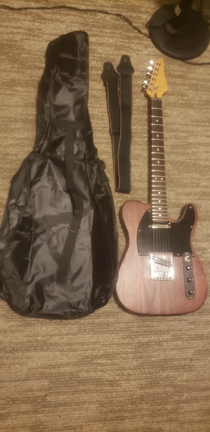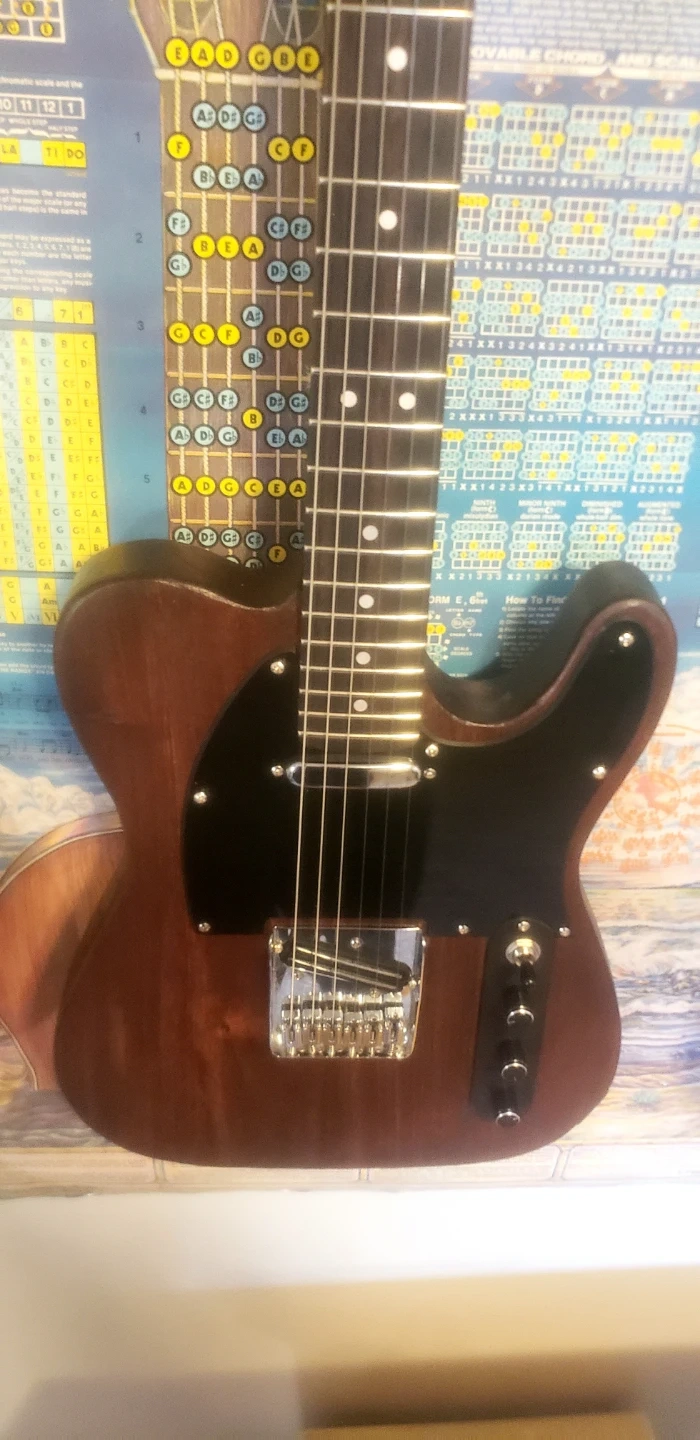 ☆Telecaster style electric guitar. It has a dark wood body and a maple neck,Rosewood fret board with Roller Saddles,Hotrail Pickup 2 Volume 1 Tone controls,String through Body, The pickguard is black with chrome hardware.,All new build...Gigbag+Strap included ,located in Marlborough NE