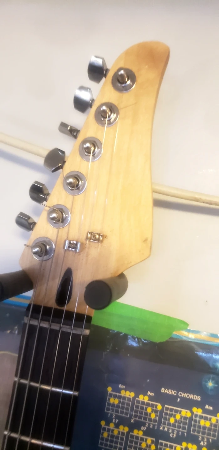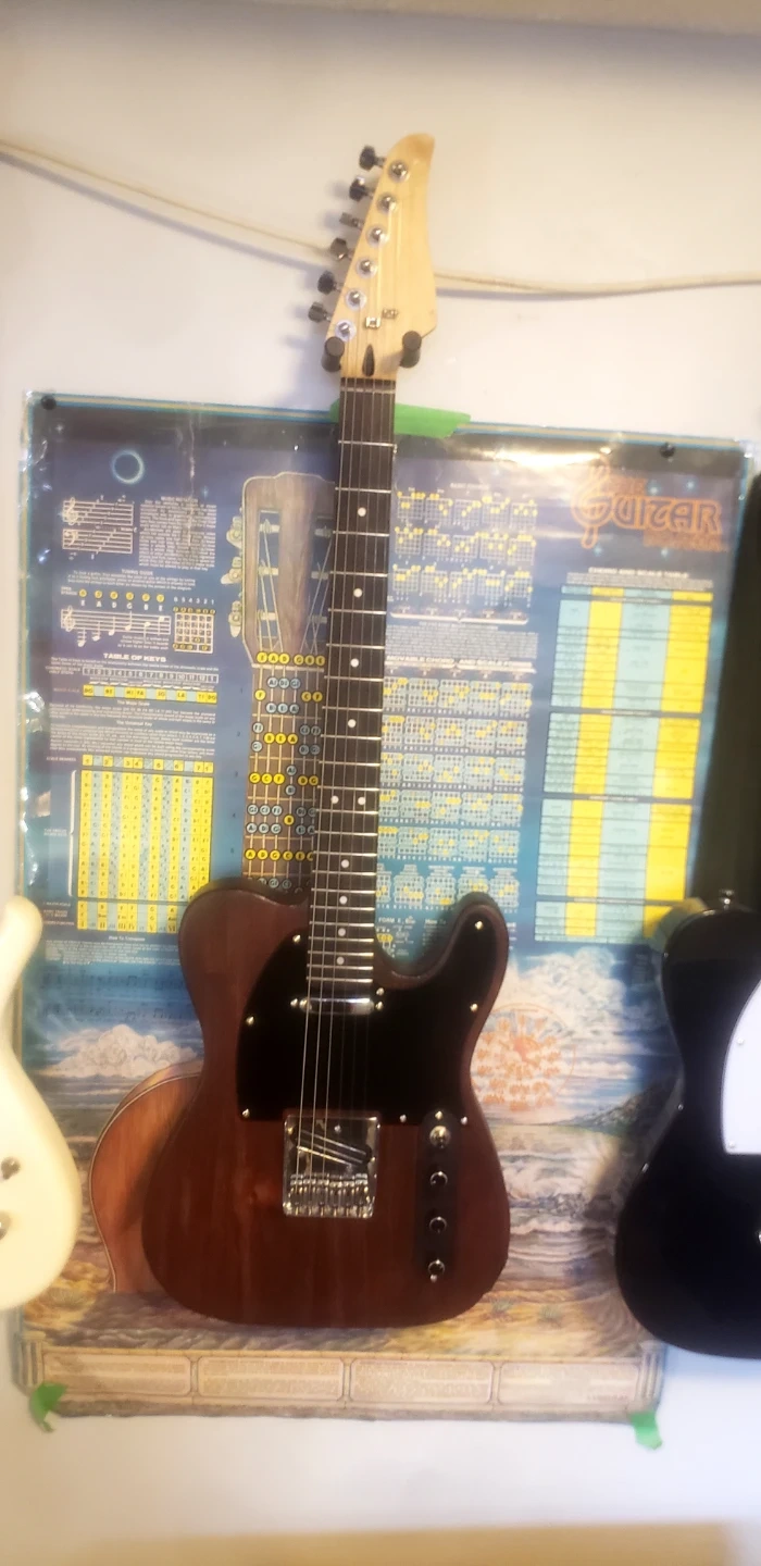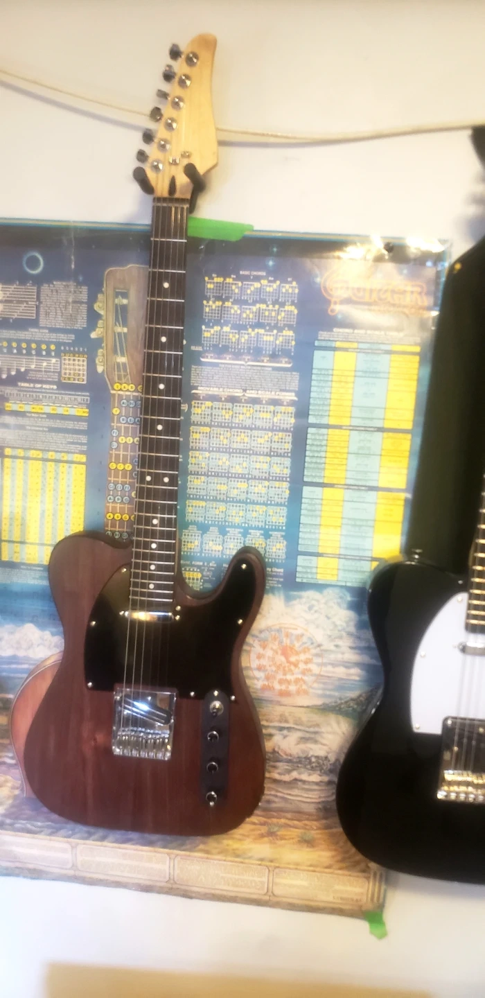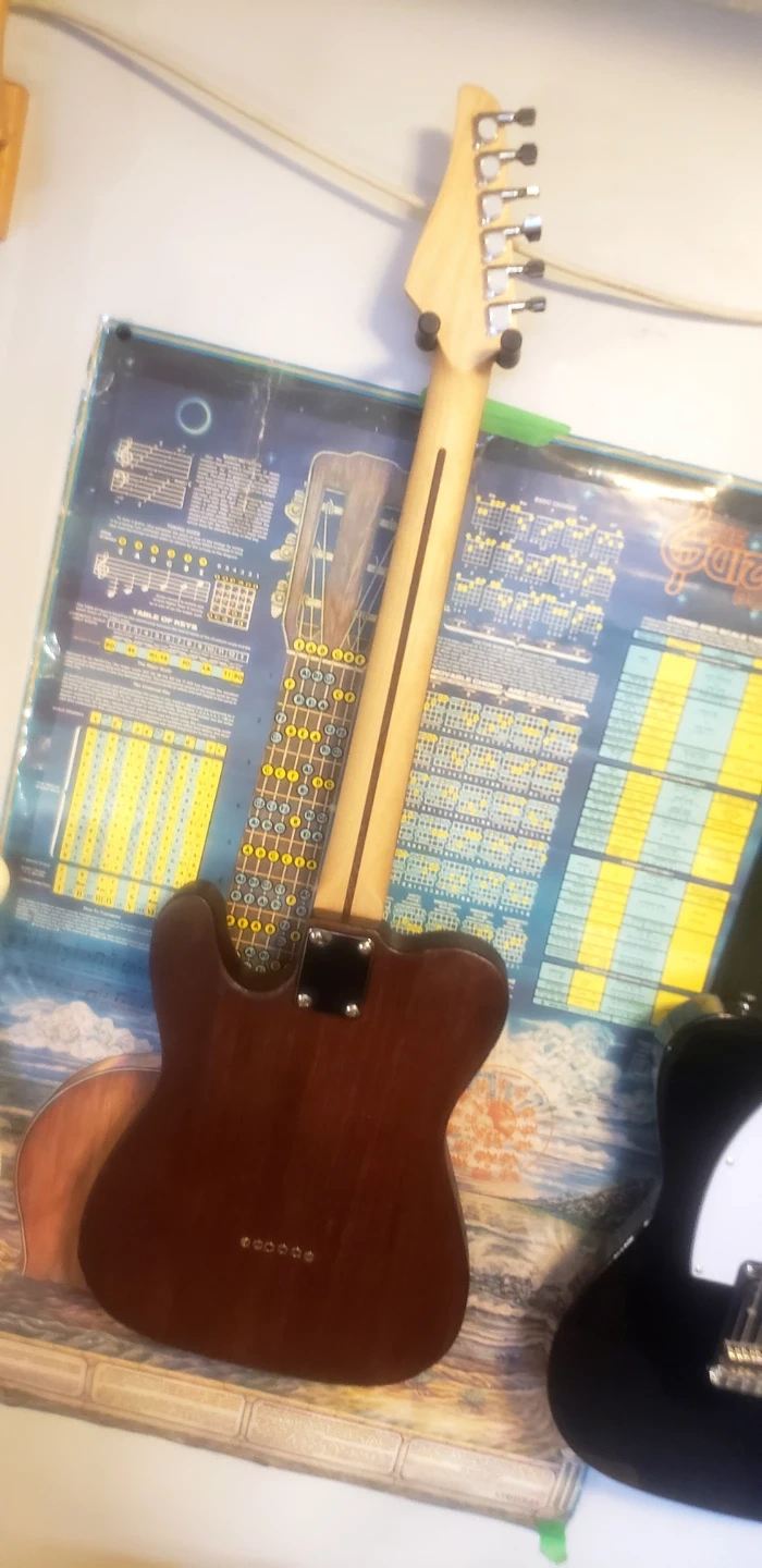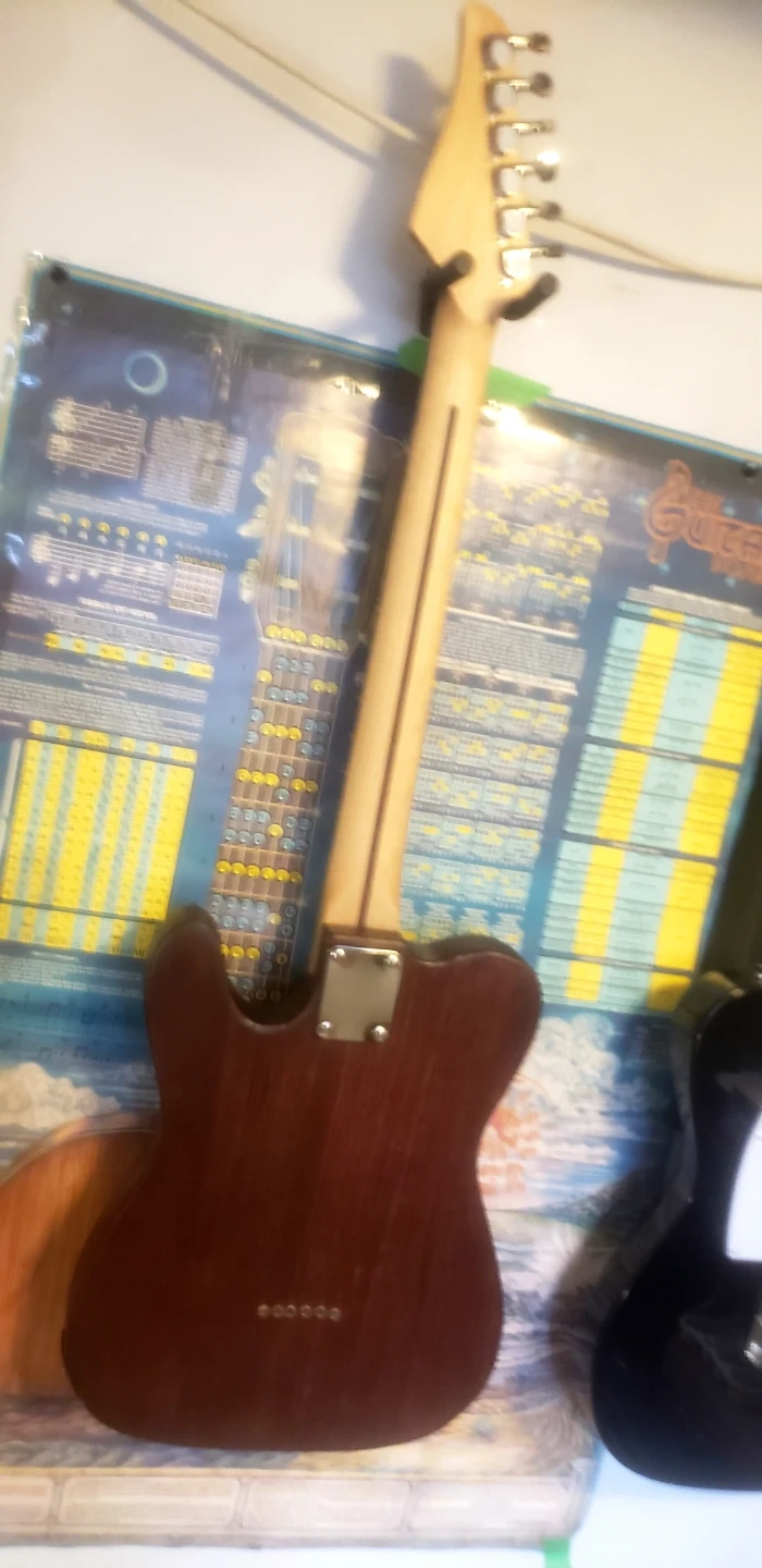 ☆Telecaster style electric guitar. It has a dark wood body and a maple neck,Rosewood fret board with Roller Saddles,Hotrail Pickup 2 Volume 1 Tone controls,String through Body, The pickguard is black with chrome hardware.,All new build...Gigbag+Strap included ,located in Marlborough NE