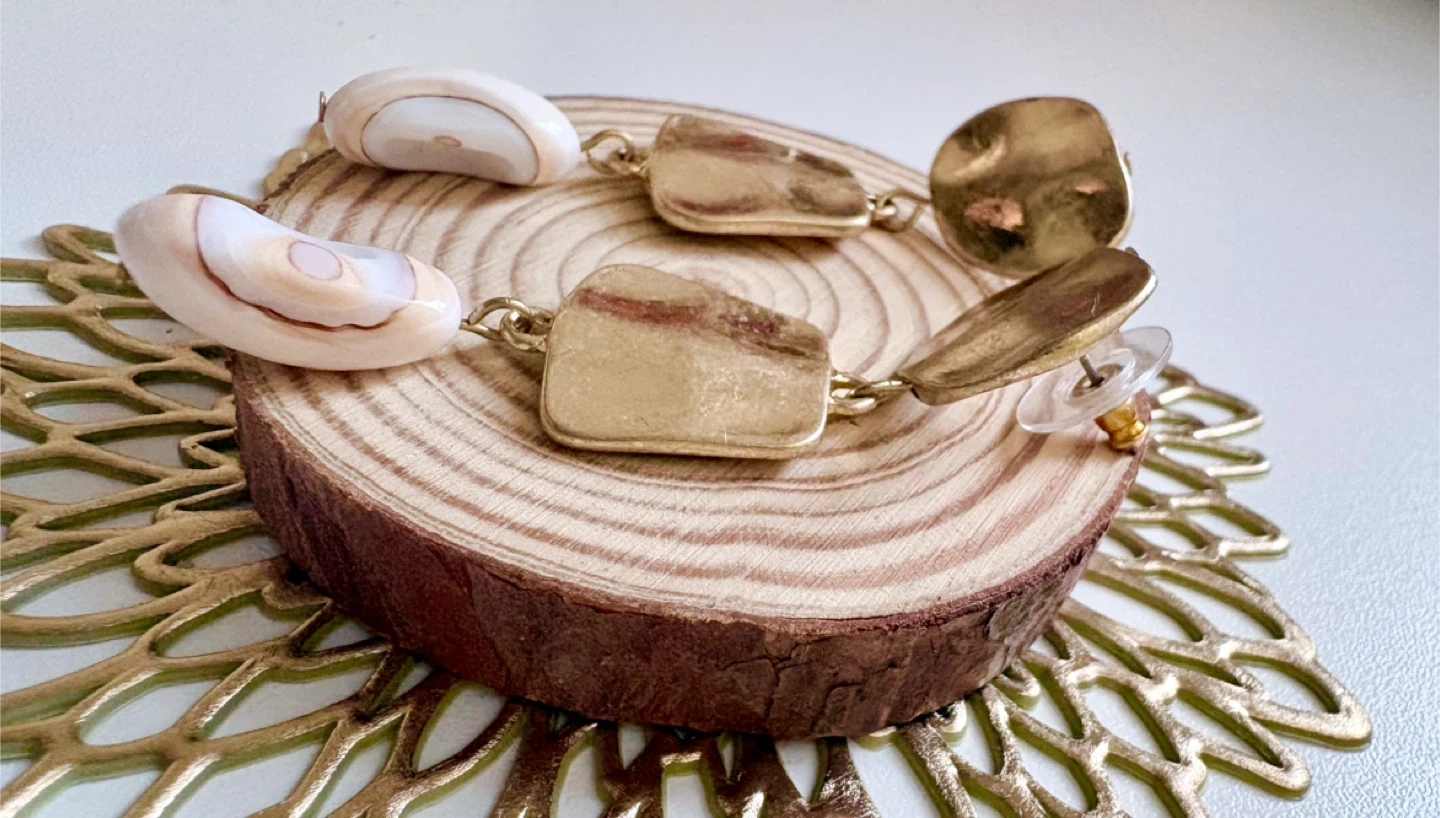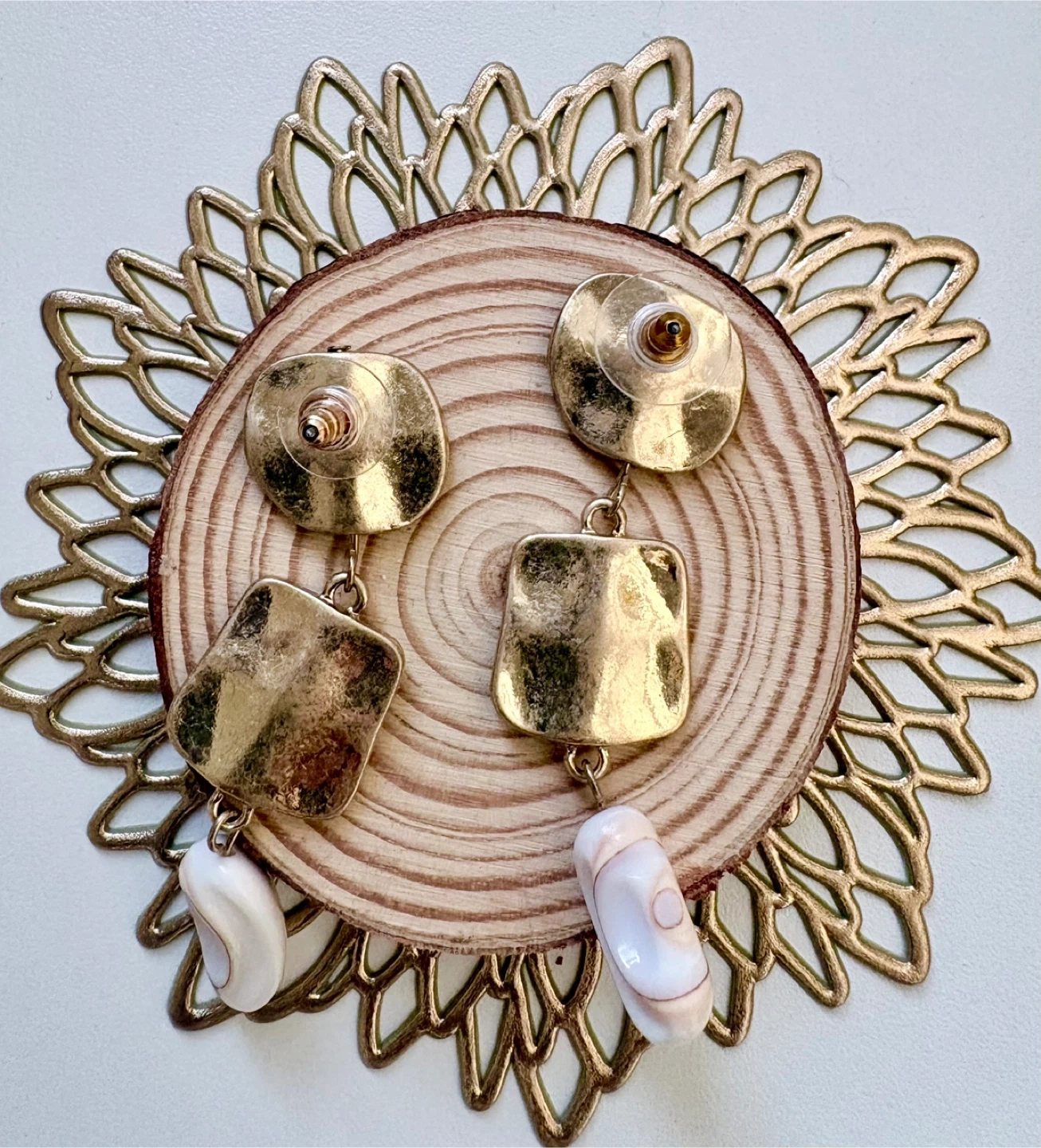 Matte Gold tone earrings featuring geometric shapes and natural white shell beads. They have a post back closure.