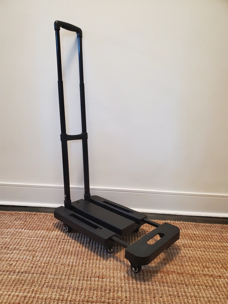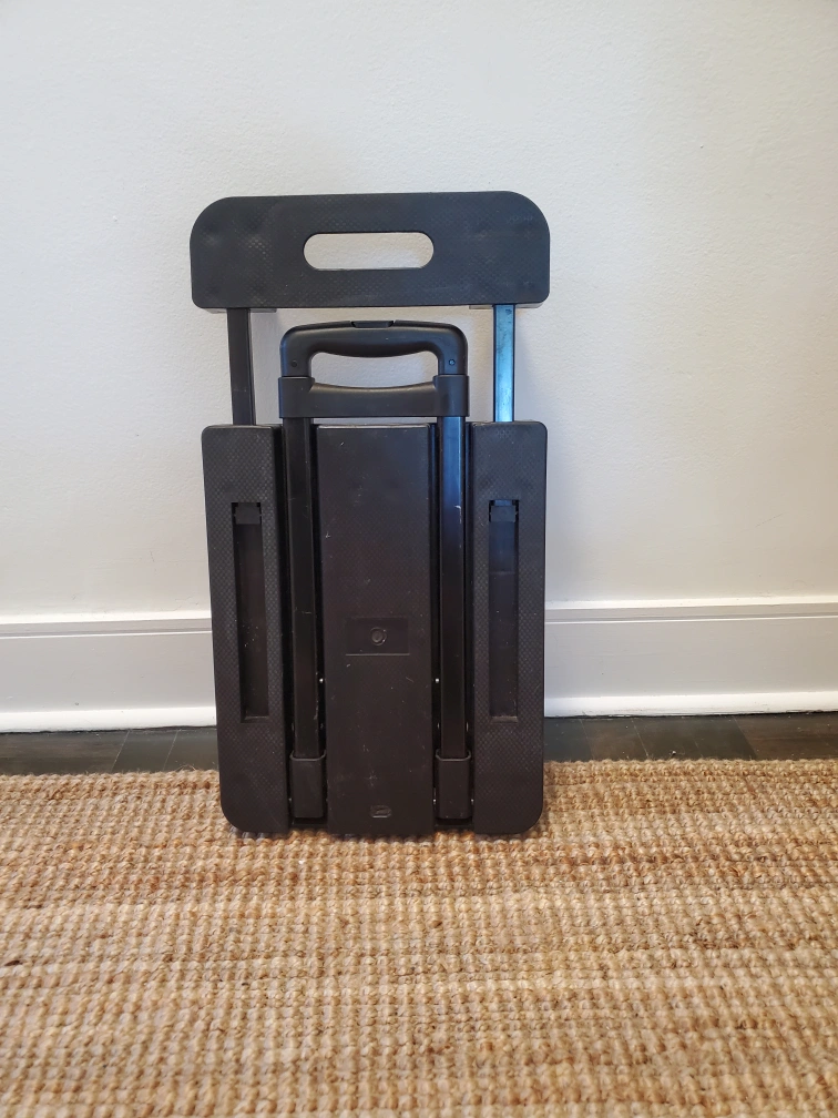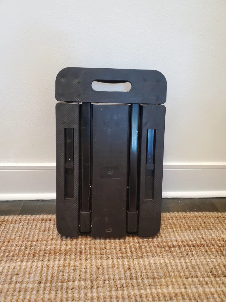Selling a handy folding dolly/cart in black. It's perfect for carrying boxes or luggage, and folds up for easy storage when not in use. Great for travel or moving things around the house!