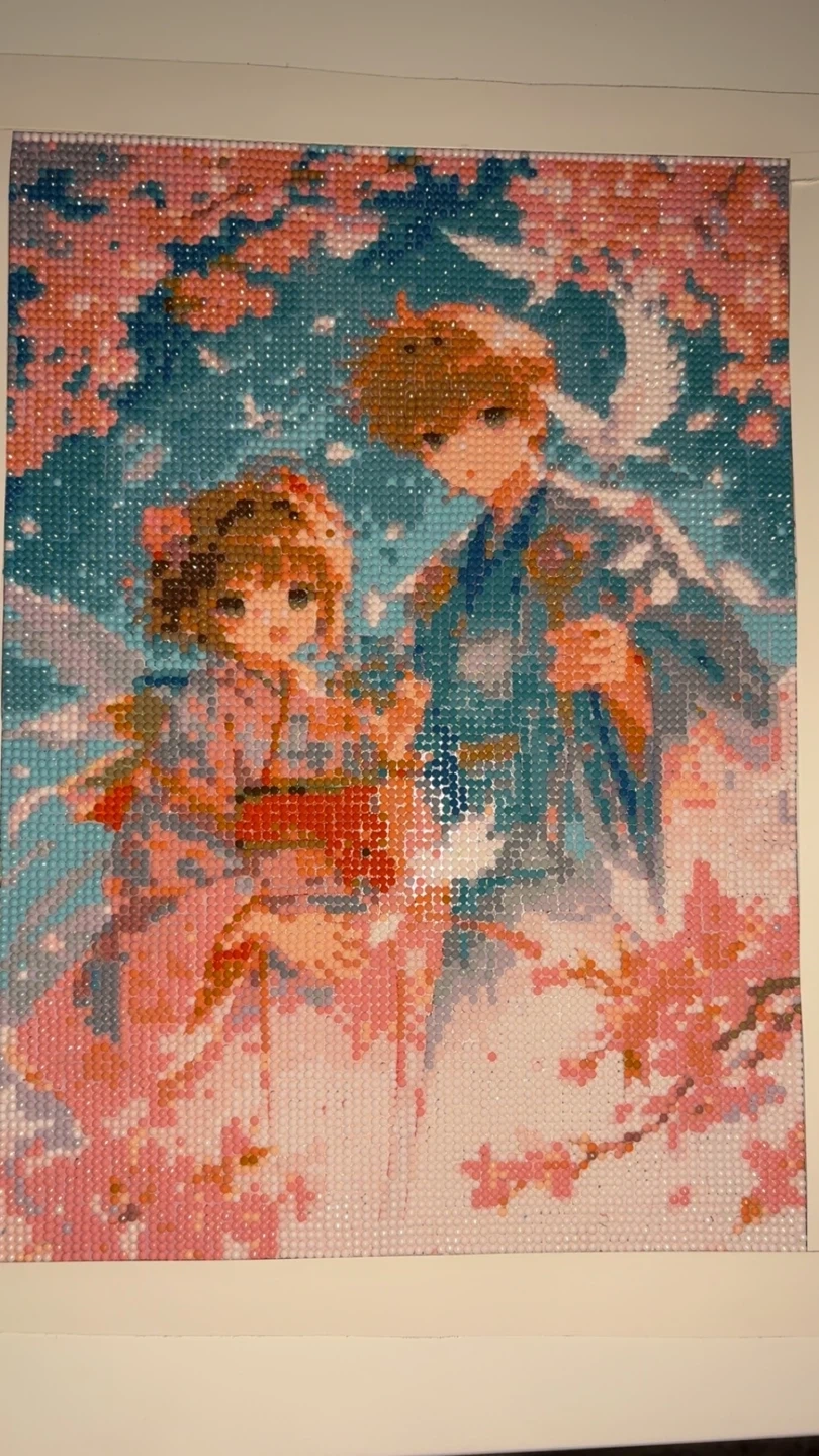Completed diamond painting featuring an anime couple among cherry blossoms. The artwork uses a vibrant palette of pinks, blues, and whites. It's a beautiful piece for any fan of anime or Japanese-inspired art.