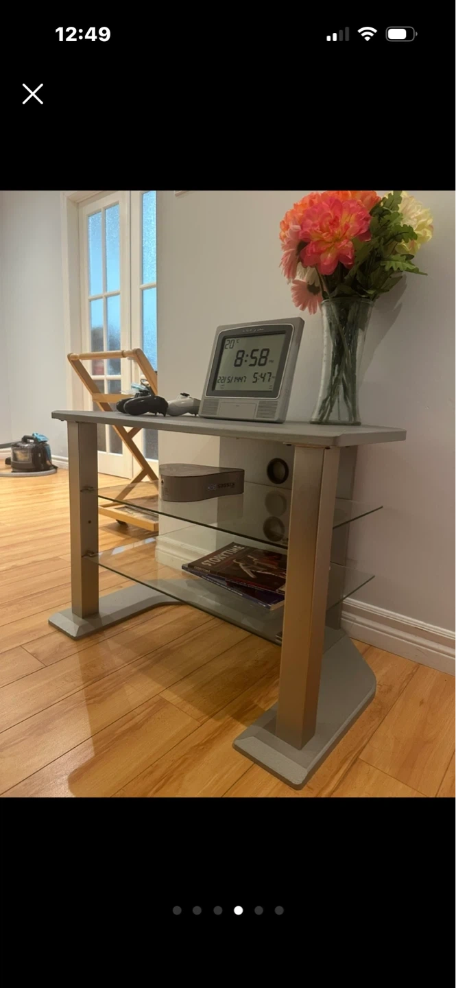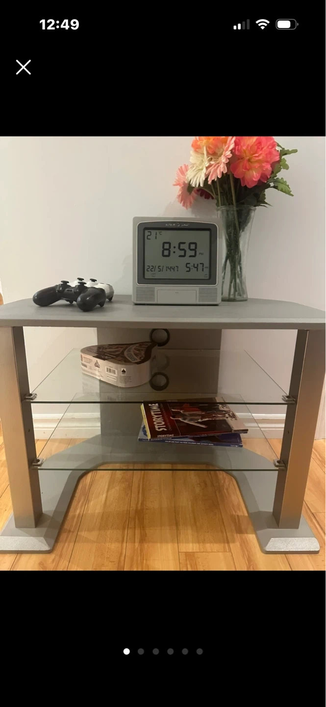 Selling a silver TV stand that's perfect for your living room or entertainment area! It features sturdy construction and sleek glass shelves, providing ample space for your media devices, gaming consoles, or decorative items. It's in great condition and ready to find a new home