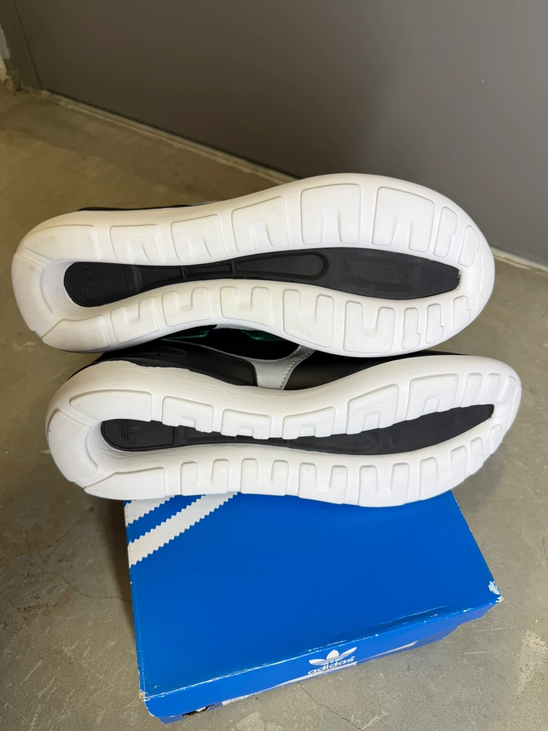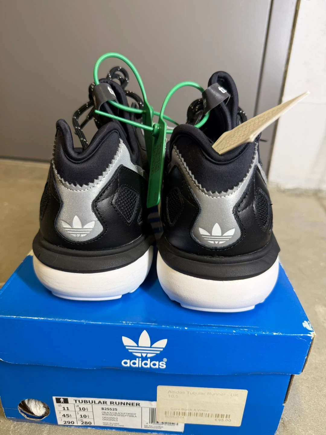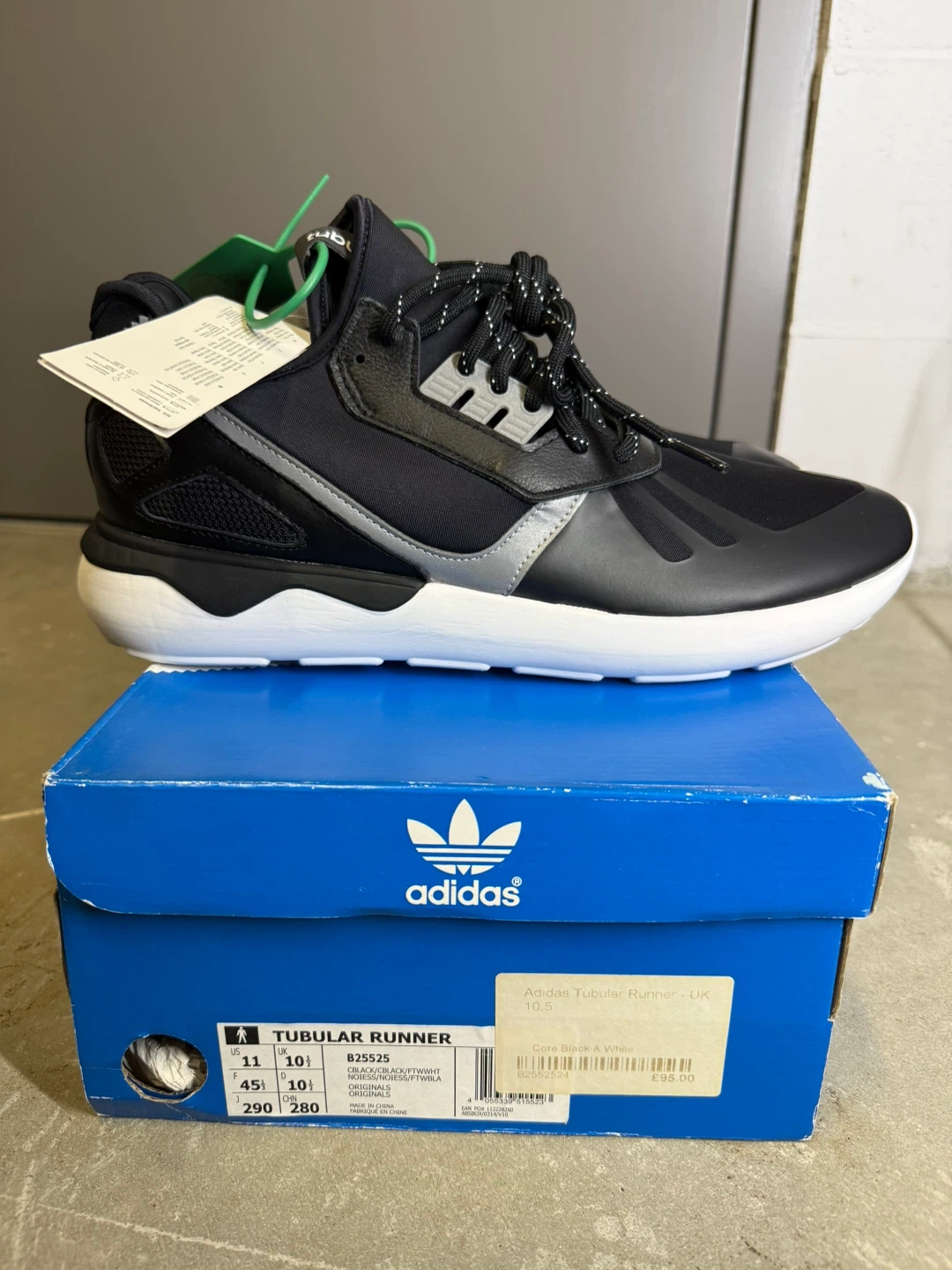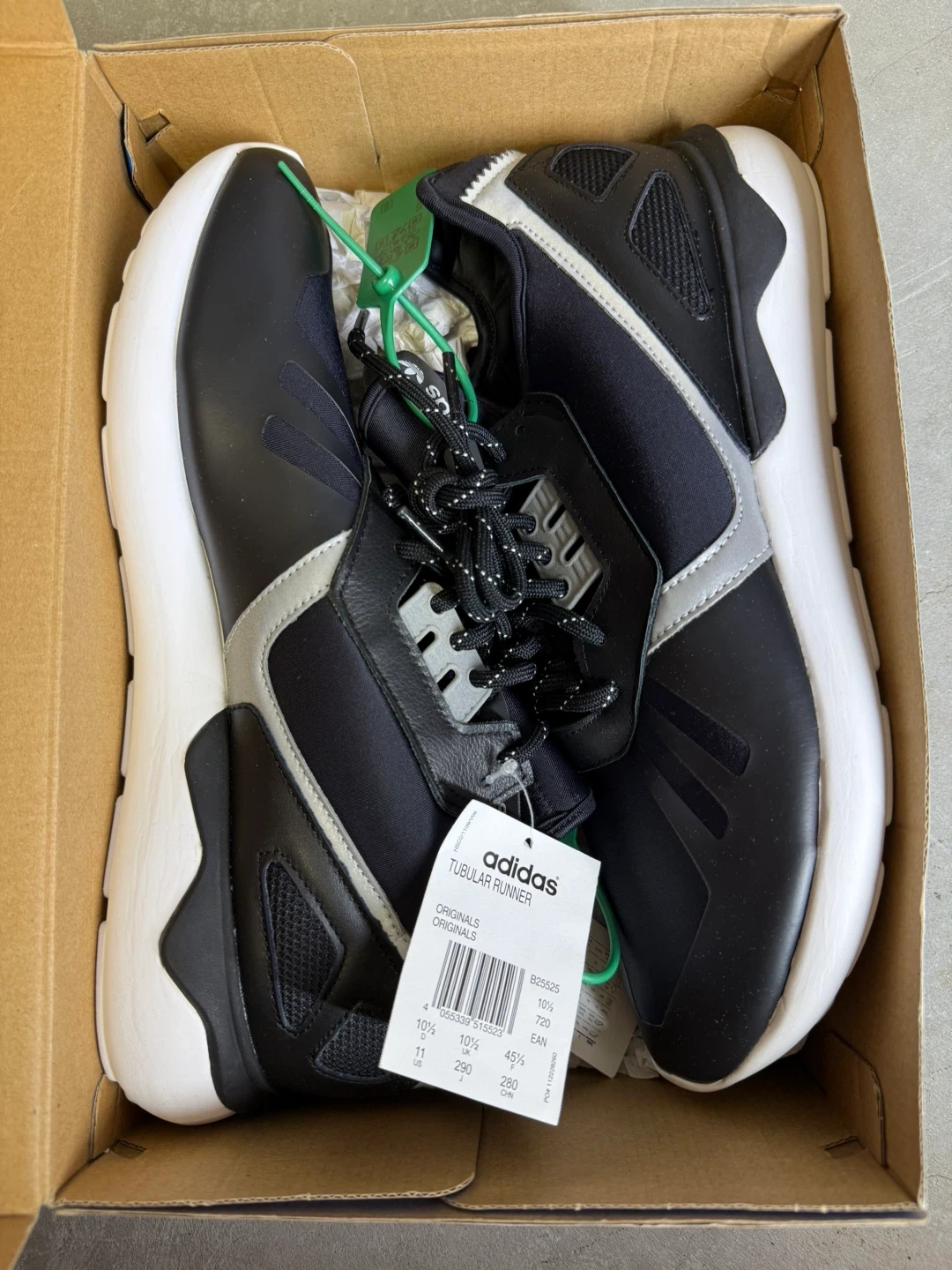 Adidas Tubular Runner sneakers in black, white, and silver. Includes original box and tags. Men's size 11 (UK 10.5, EUR 45, 290mm). These shoes are perfect for everyday wear. Discounted because its age. NEW.