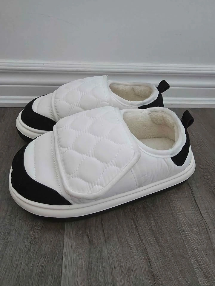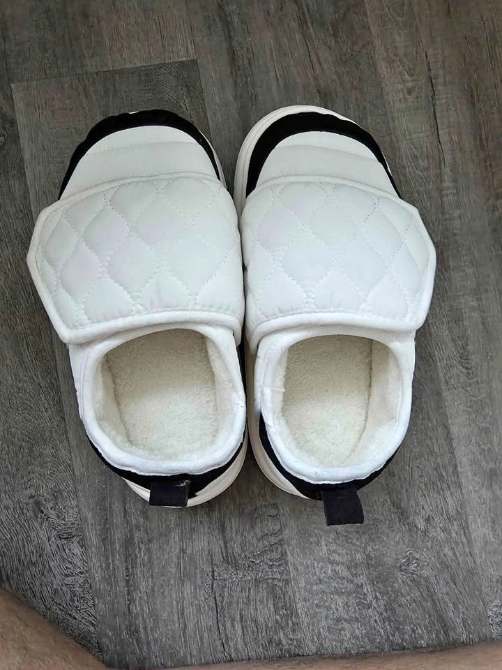 Comfy white quilted puffer slippers. Size 8. Has plush inner lining for extra warmth. Black accents and a thick sole.