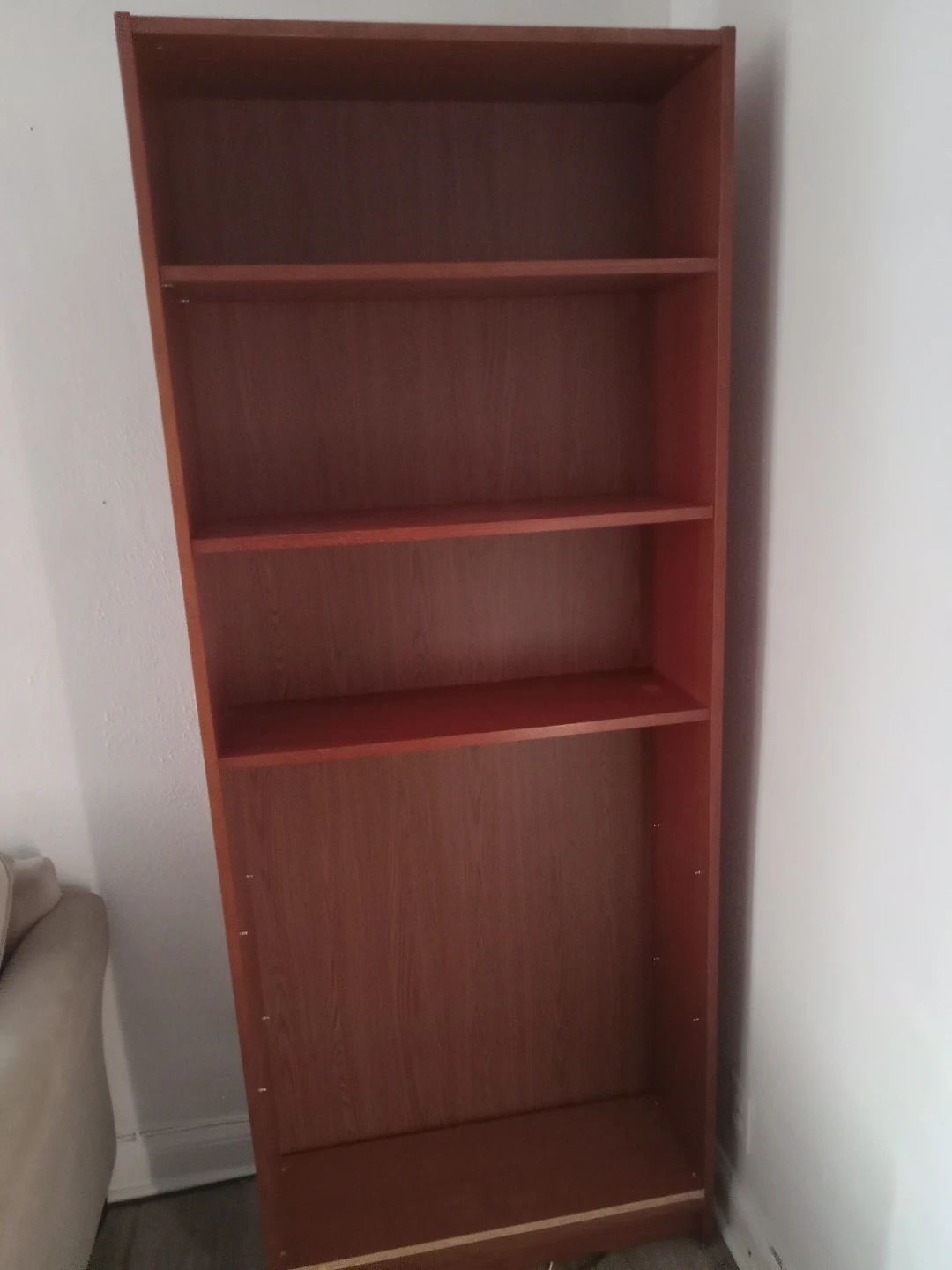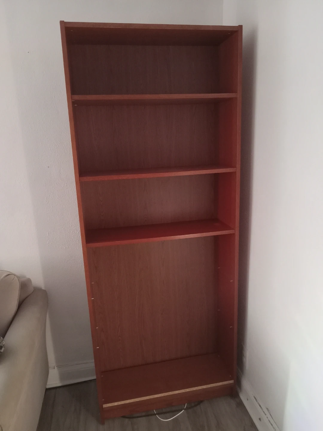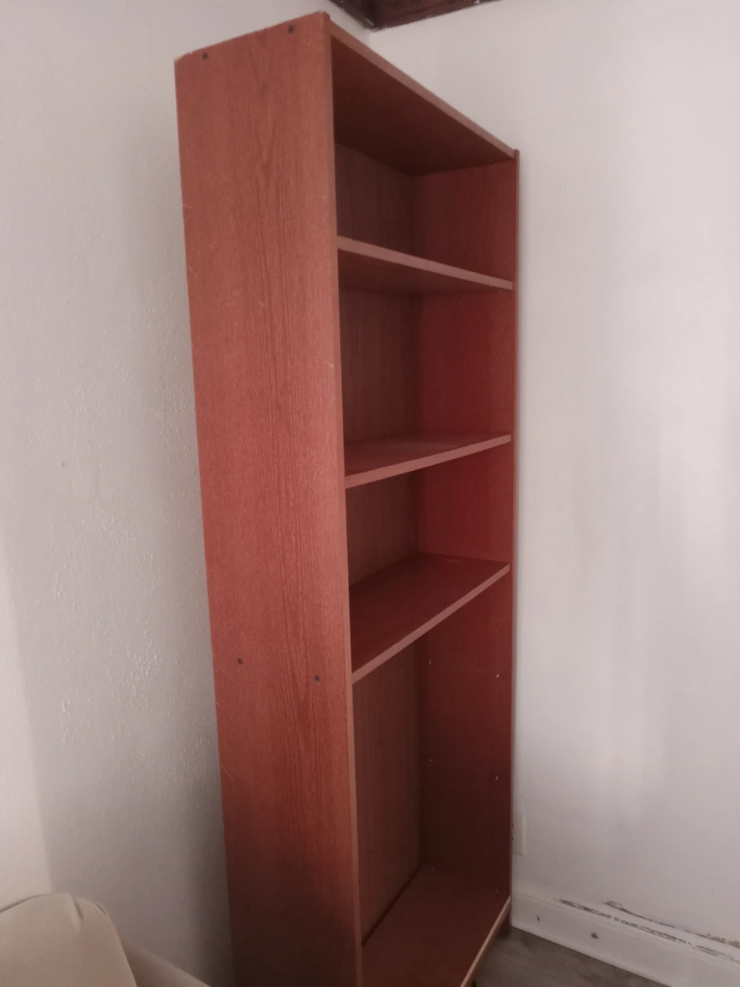 This is a tall, four-shelf bookcase. It's made of wood-look material in a reddish-brown tone. Its dimensions are roughly 70 inches tall by 24 inches wide.