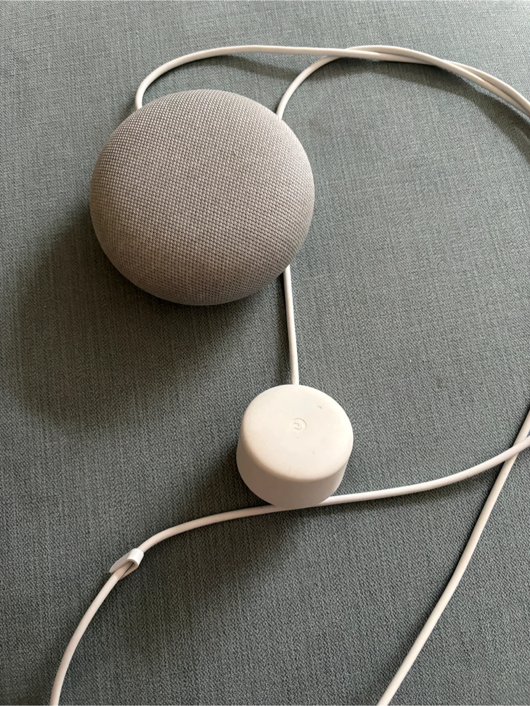 This is a Google Nest Mini, second generation, in light grey colour. It's a compact smart speaker that plays music, answers questions, and controls smart home devices. It connects via Wi-Fi.