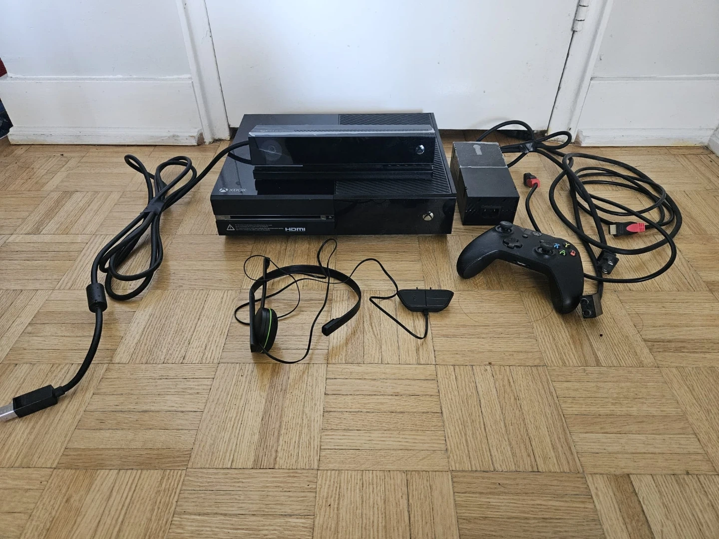 Complete Xbox One console bundle with Kinect sensor included. Comes with one black wireless controller and a gaming headset. Also includes power brick and necessary cables for setup.