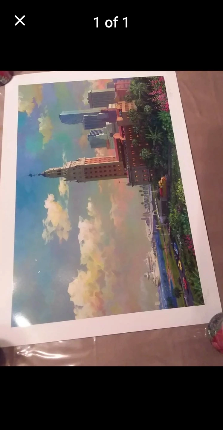 This painting depicts a vibrant Port of Miami with buildings and lush greenery under a colourful sky. It's a print on paper.