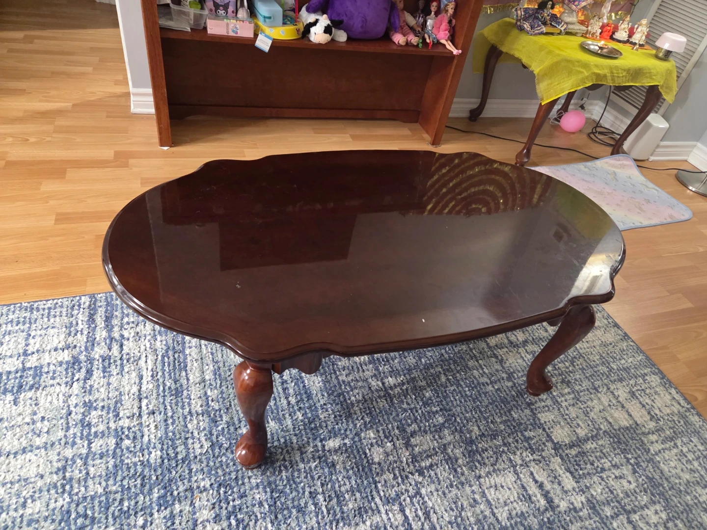 A classic dark wood oval coffee table. It has ornate carved legs and a glossy finish. This table's shape makes it a great centrepiece for your living room!