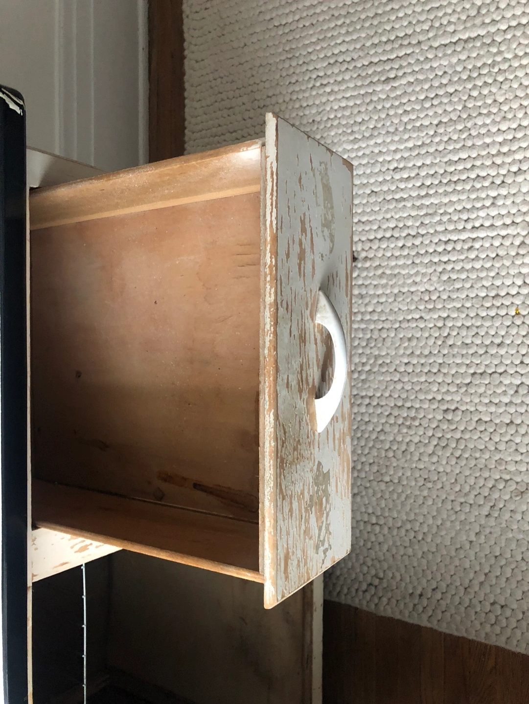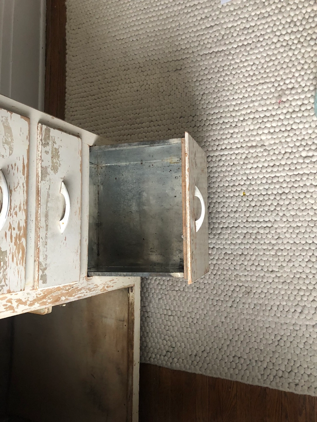 This much loved Baker’s cabinet is looking for a new home. This little gem was used for its purpose and so has a few imperfections in the pictures. Fully functional (everything works) except for the middle drawer, which does not exist. It can remain as is (stuck on) or if you are handy you can build a new drawer.