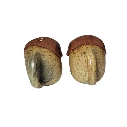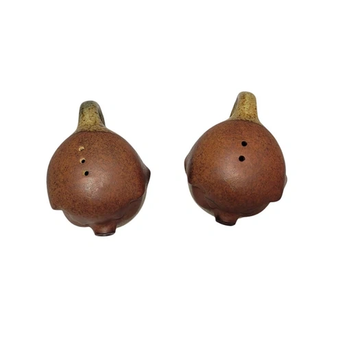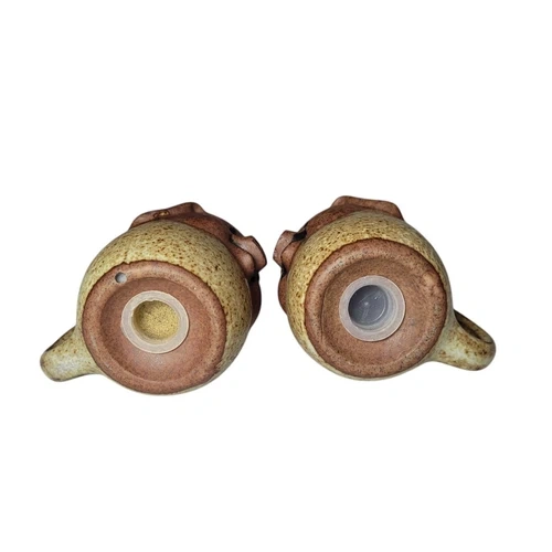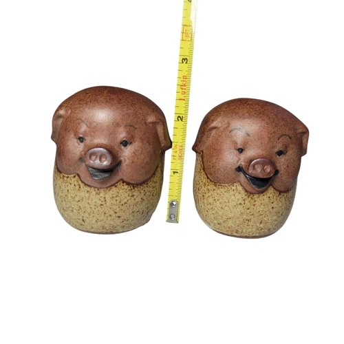 Add a touch of whimsy to your dining table with these charming UCTCI Japan Happy Pig Salt & Pepper Shakers. Made of durable stoneware in a cute pig shape, this set includes a pepper shaker, salt shaker, and toothpick holder. Perfect for all occasions, these small brown shakers feature a mid-century modernism style and are sure to be a conversation starter. Imported from Japan and dating back to the 1970s, these original pieces will bring a playful element to your kitchen decor. If you are interested in more than one item, feel free to contact me and I can combine them.
