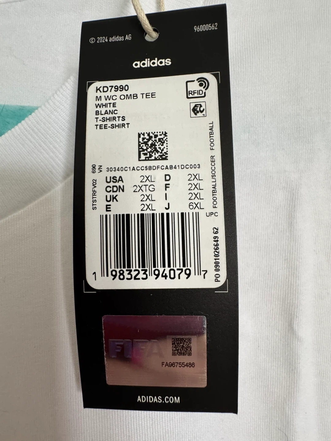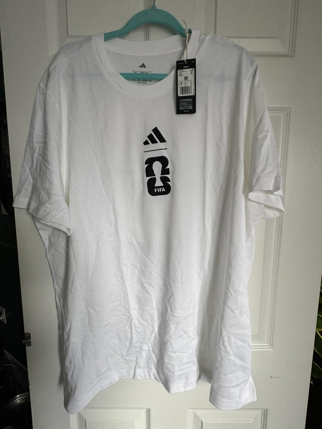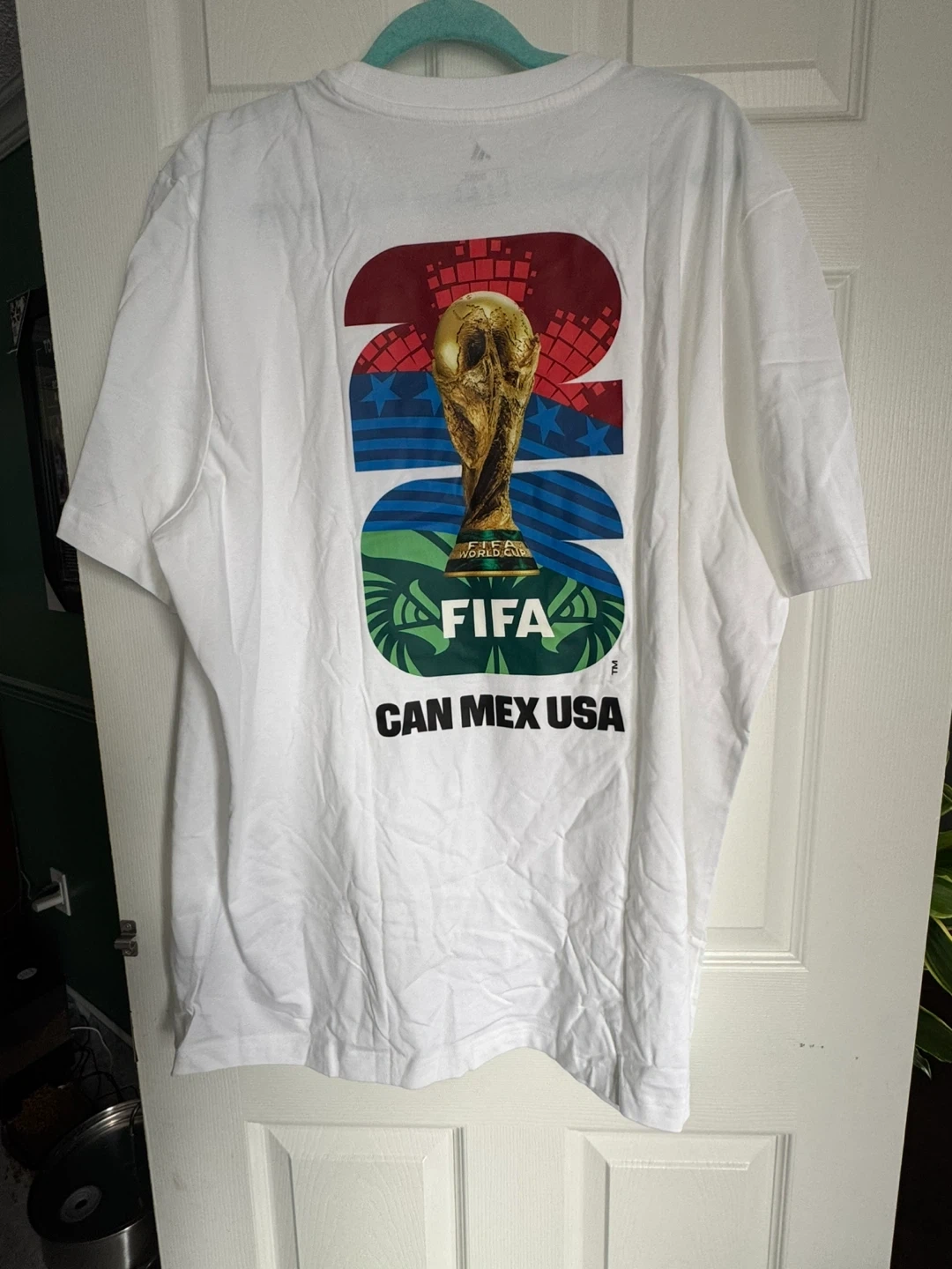 Brand new Adidas t-shirt celebrating the 2026 FIFA World Cup hosted in CAN, MEX, and USA. It's a white tee with official FIFA and Adidas branding. Made of cotton for comfort.