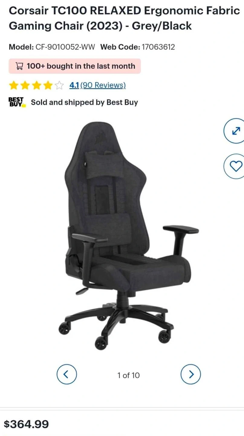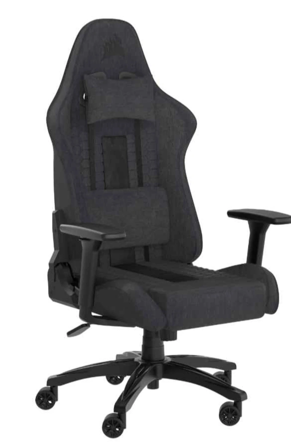 New in box Corsair TC100 RELAXED ergonomic gaming chair. It's upholstered in grey fabric. Includes a lumbar pillow and neck pillow for comfort. This chair is built for long gaming sessions!