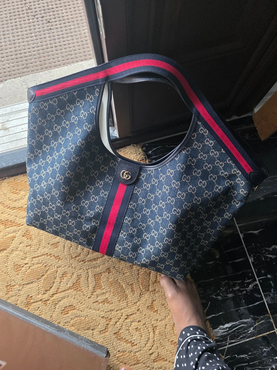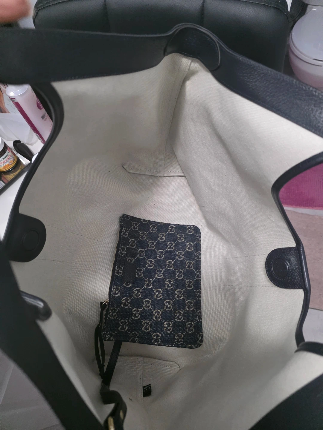 It includes a matching small pouch for essentials. Spacious interior and comfortable leather handles.